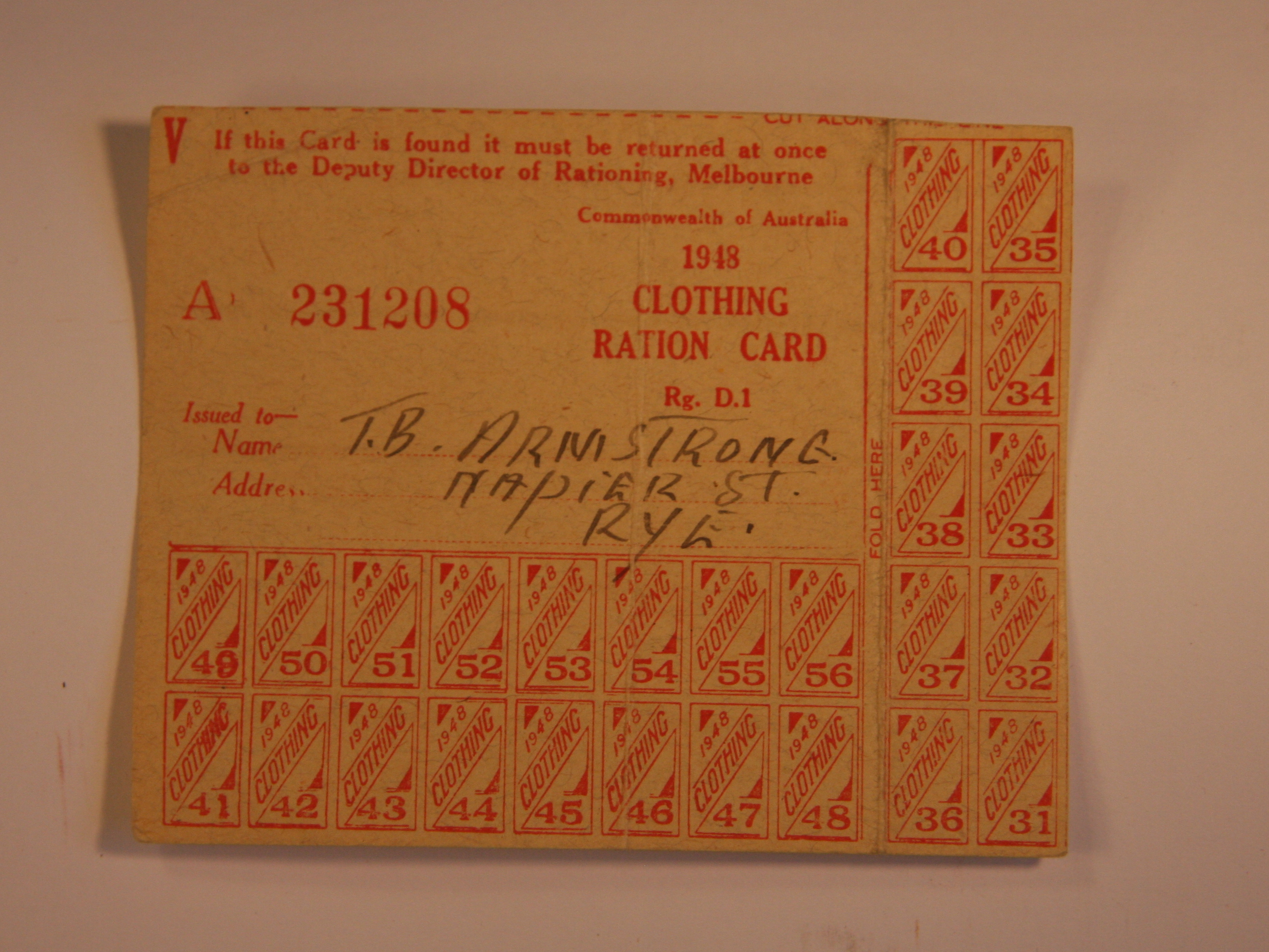 Clothing Ration Card - T.B. Armstrong
