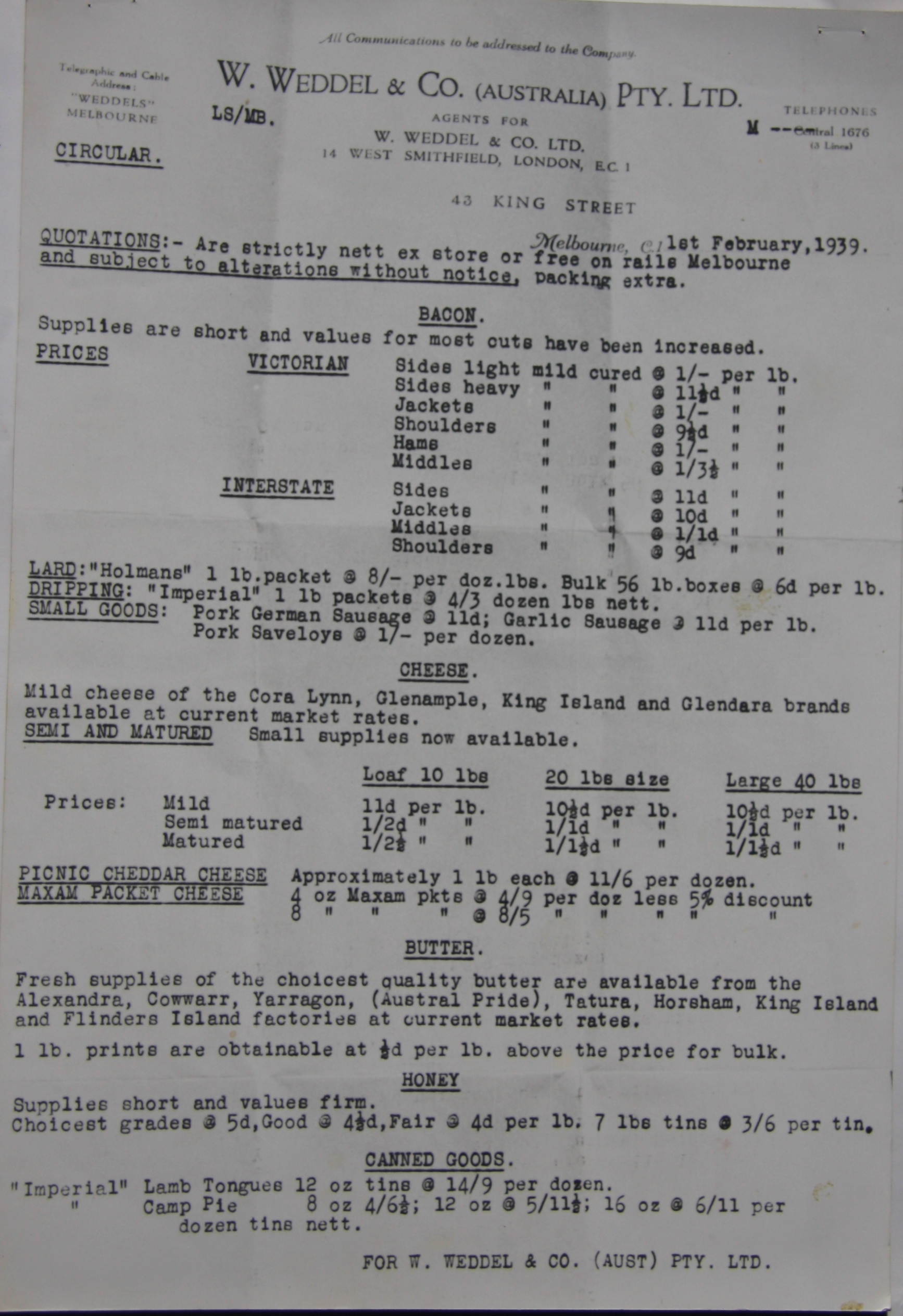 DESCRIPTIONPrice list of foodstuffs - (Meat, cheese, bacon, butter, honey & canned goods).