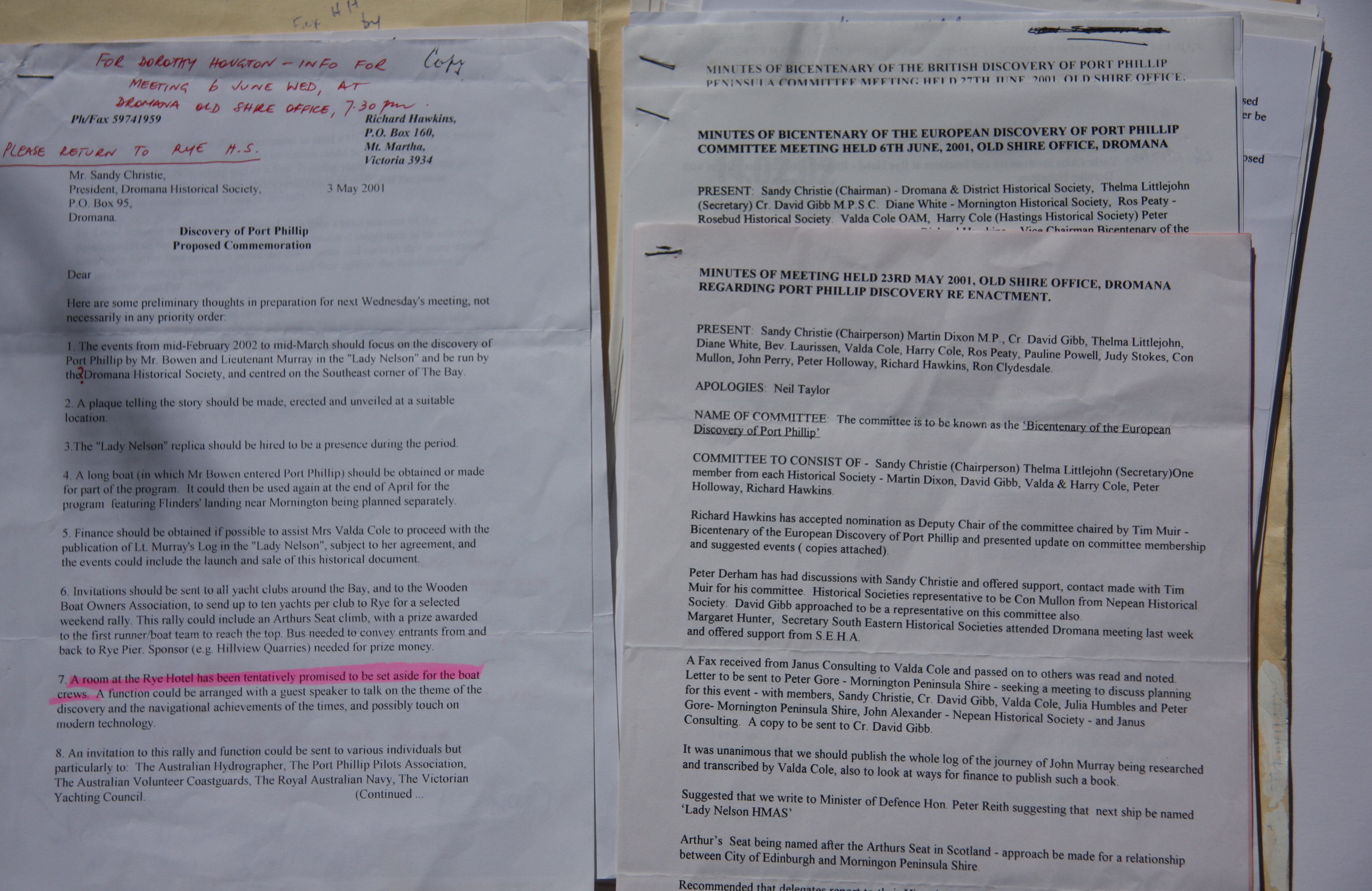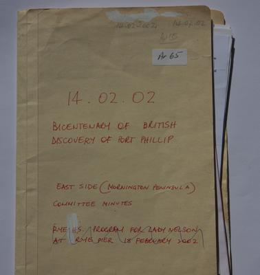 DESCRIPTIONEast Side (Mornington Peninsula) Committee Minutes. Minutes of main (14/02/02) Committee Rye program for Lady Nelson conducted on end of Rye Pier.