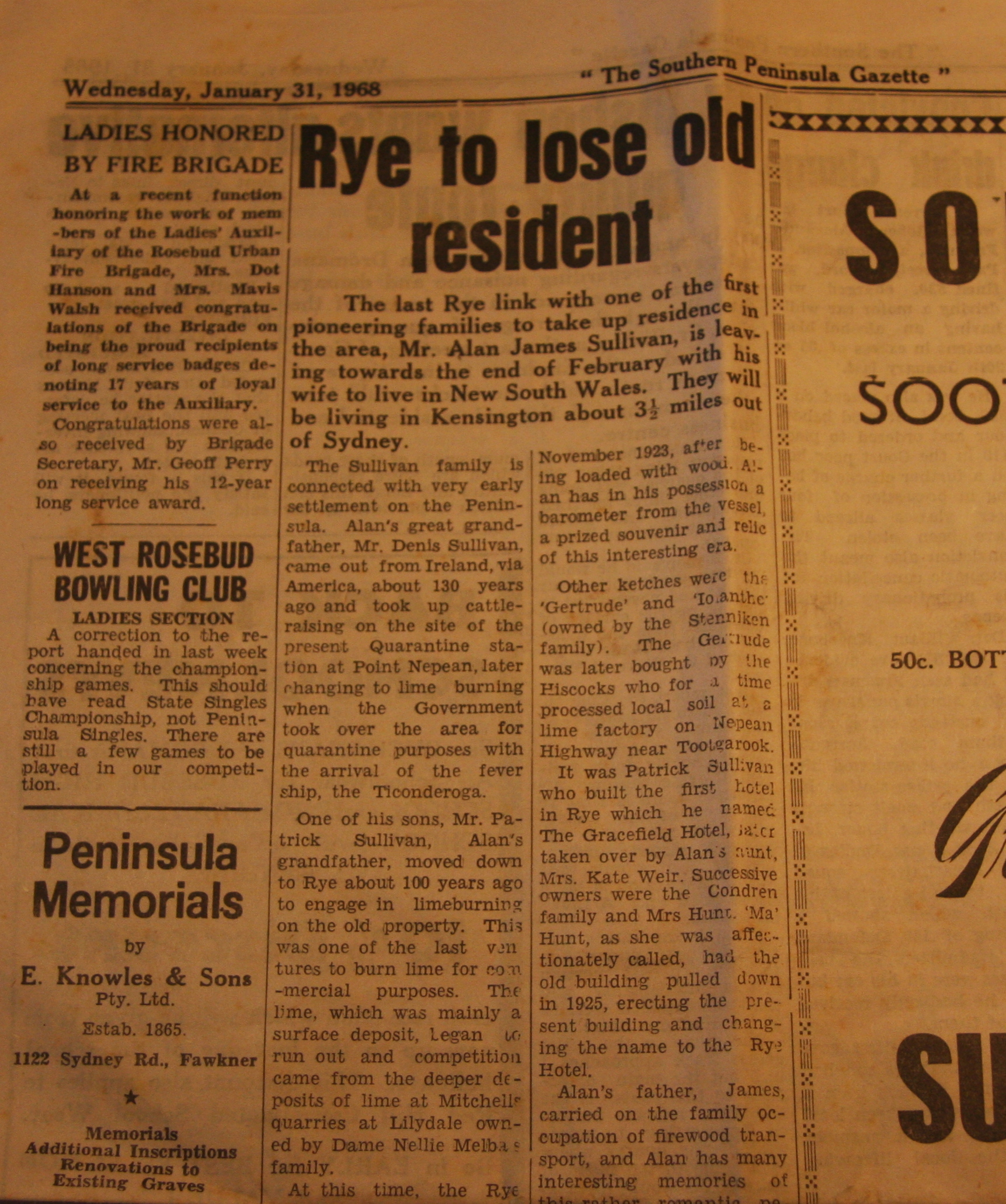 DESCRIPTION“Rye to Lose Old Resident - Mr Alan James Sullivan”