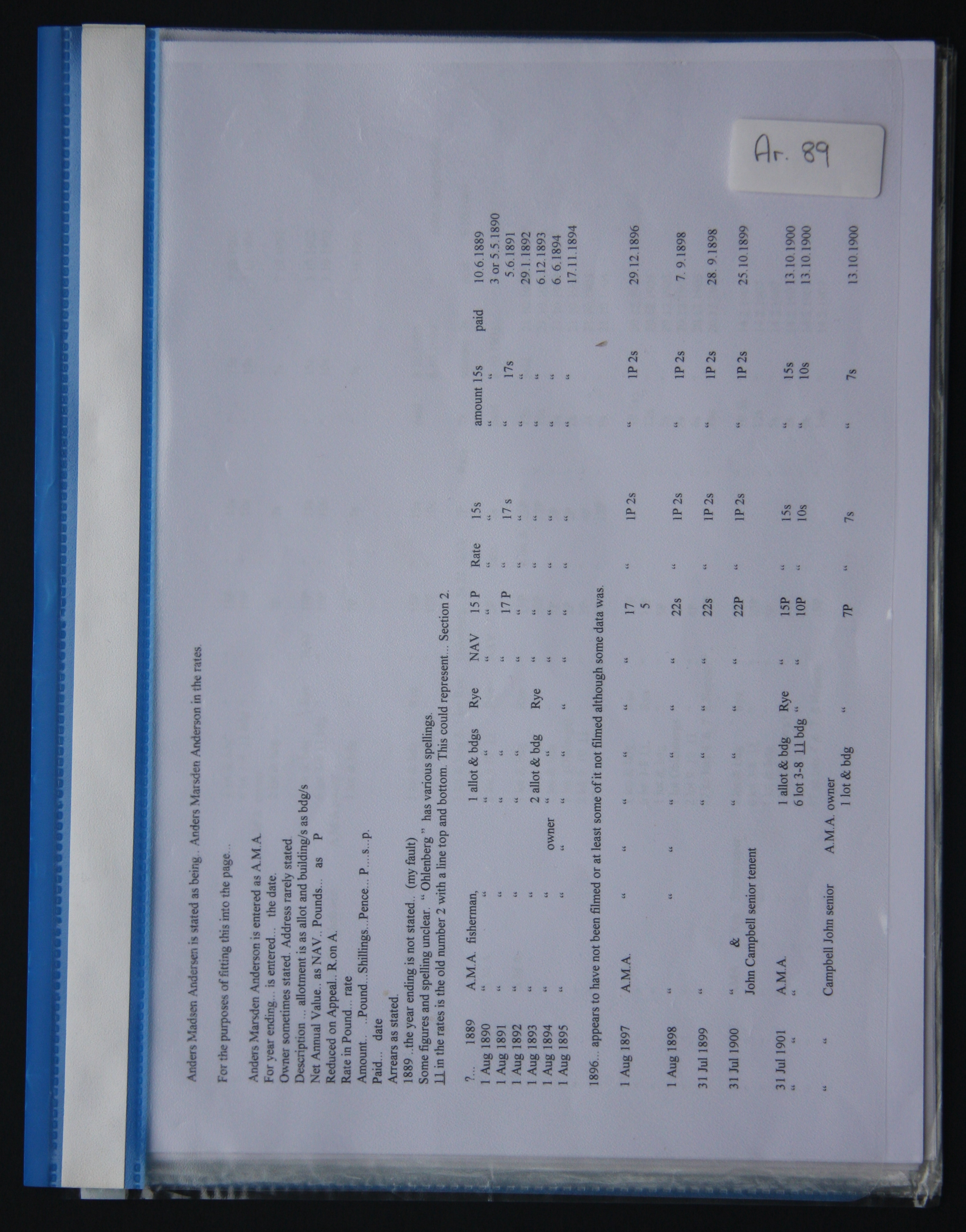DESCRIPTIONOriginal enquiry to Southern Peninsula FHS from a Pat Clayton in 2001 wishing to find information regarding her ancestor, Anders Madsen Andersen, a resident of Rye in the early 1900s. Papers include correspondence and Mornington Peninsula Shire rates information.