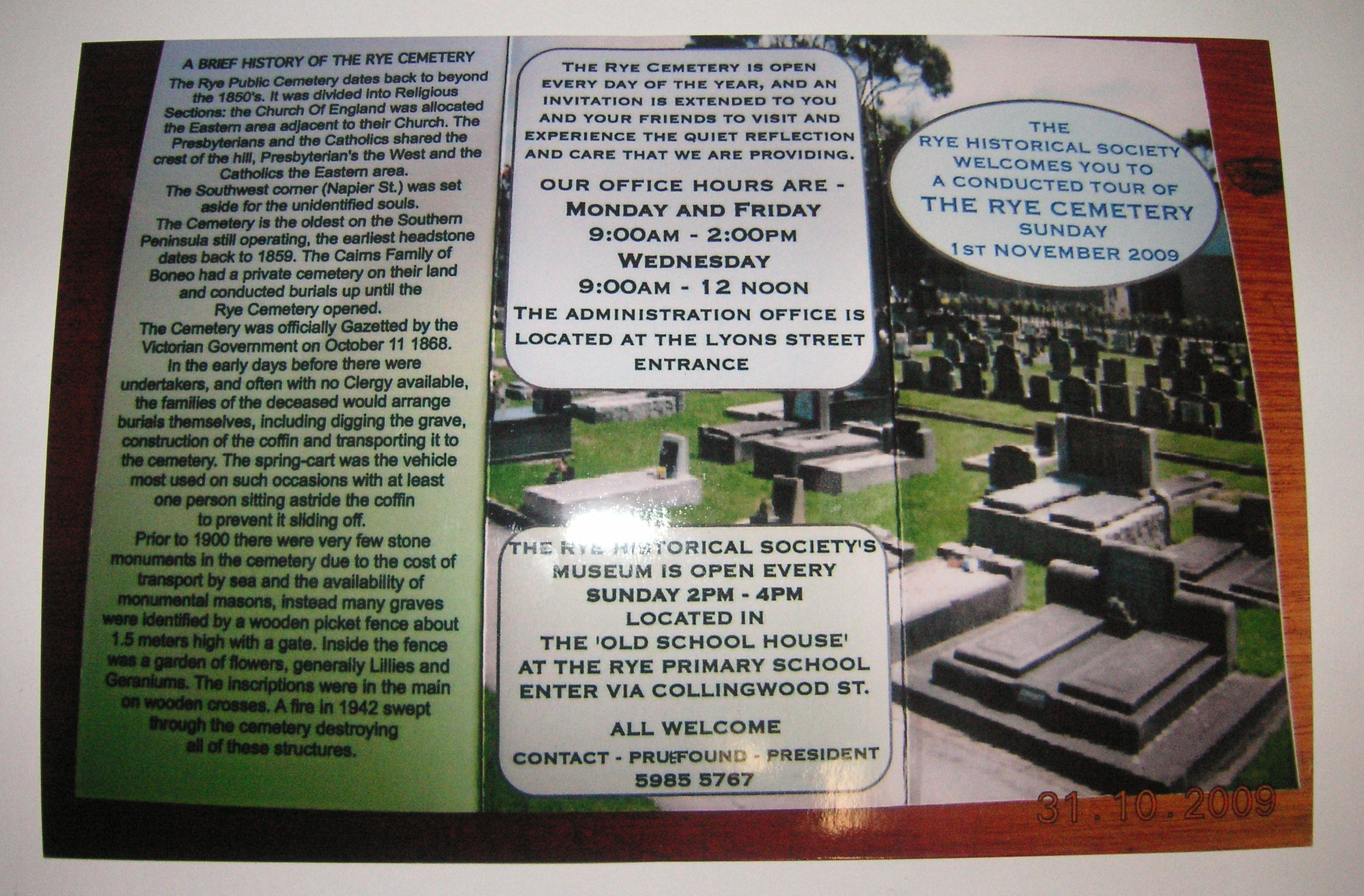 HISTORYAnnual tours of the Rye Cemetery are conducted by Phil Cain. This is a record of the graves in the cemetery in 2009 with histories/descriptions. Betty Cain photographed this record.
