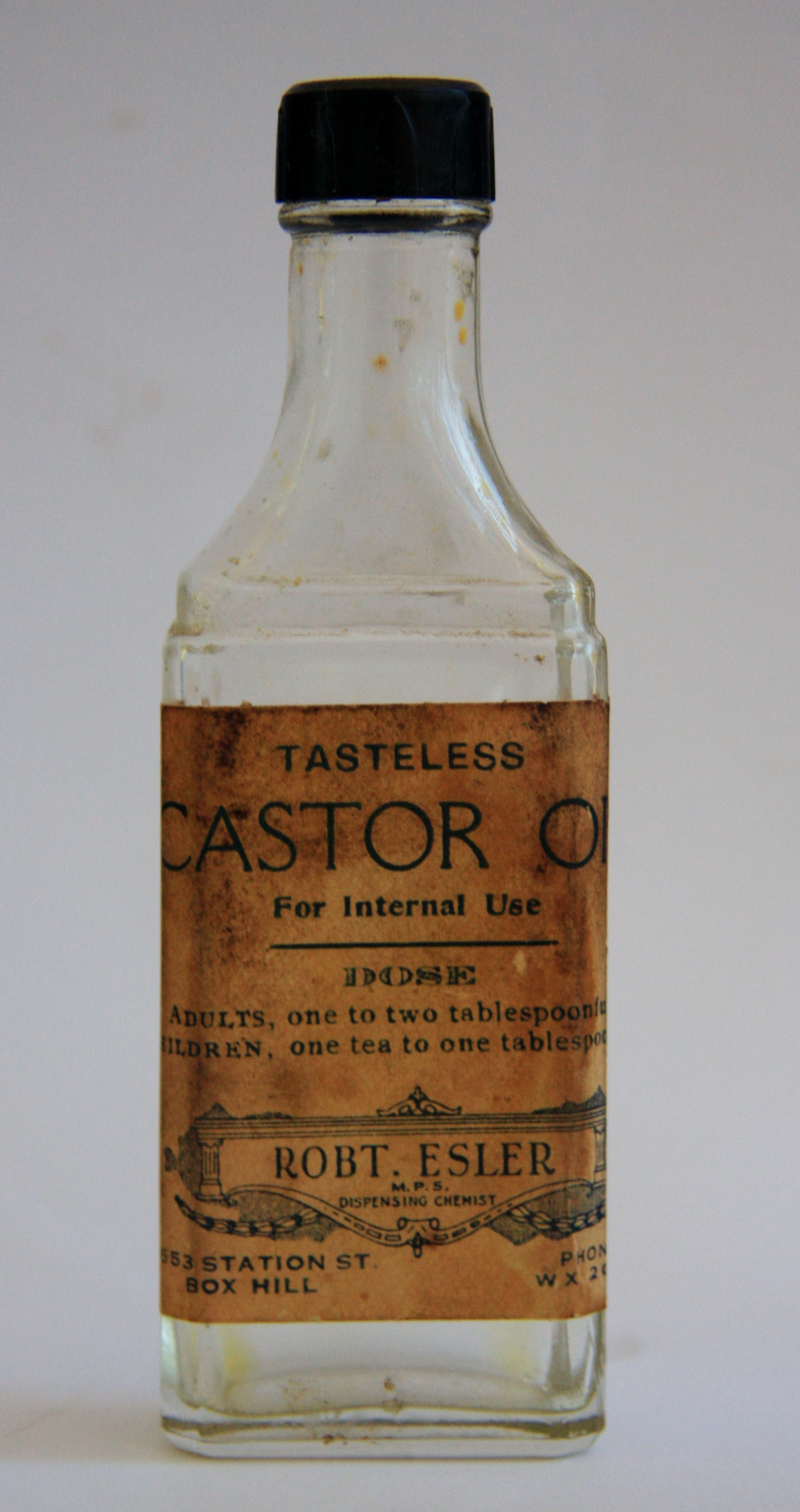 DESCRIPTIONGlass bottle for castor oil. Flat bottle with neck and Bakelite lid.