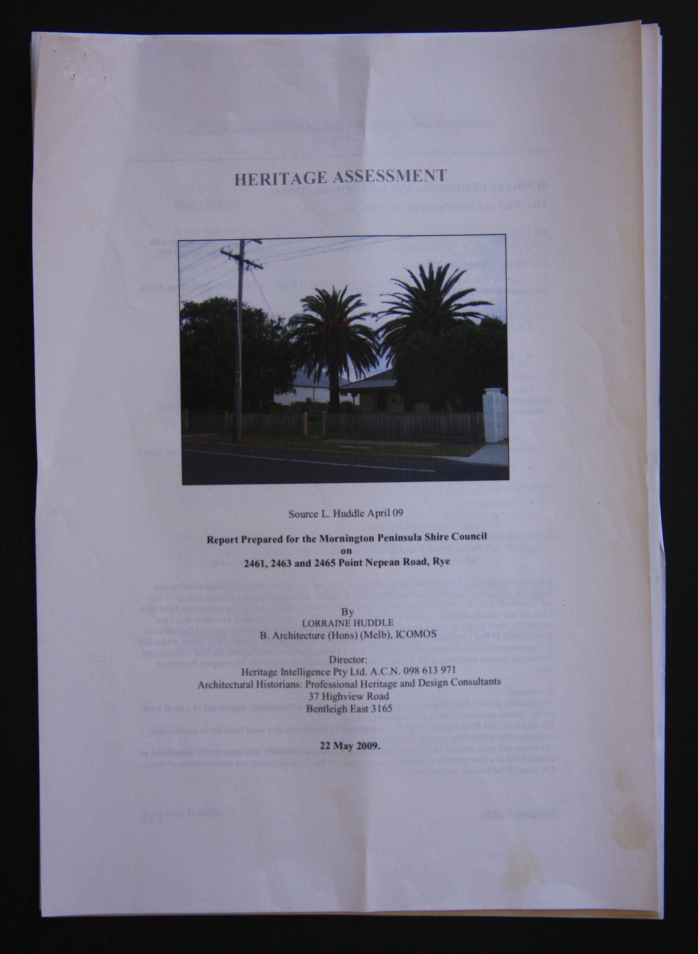 DESCRIPTIONHeritage Assessment of 2461, 2463 and 2465 Pt Nepean Road, by Lorraine Huddle for Shire of Mornington Peninsual 2009.