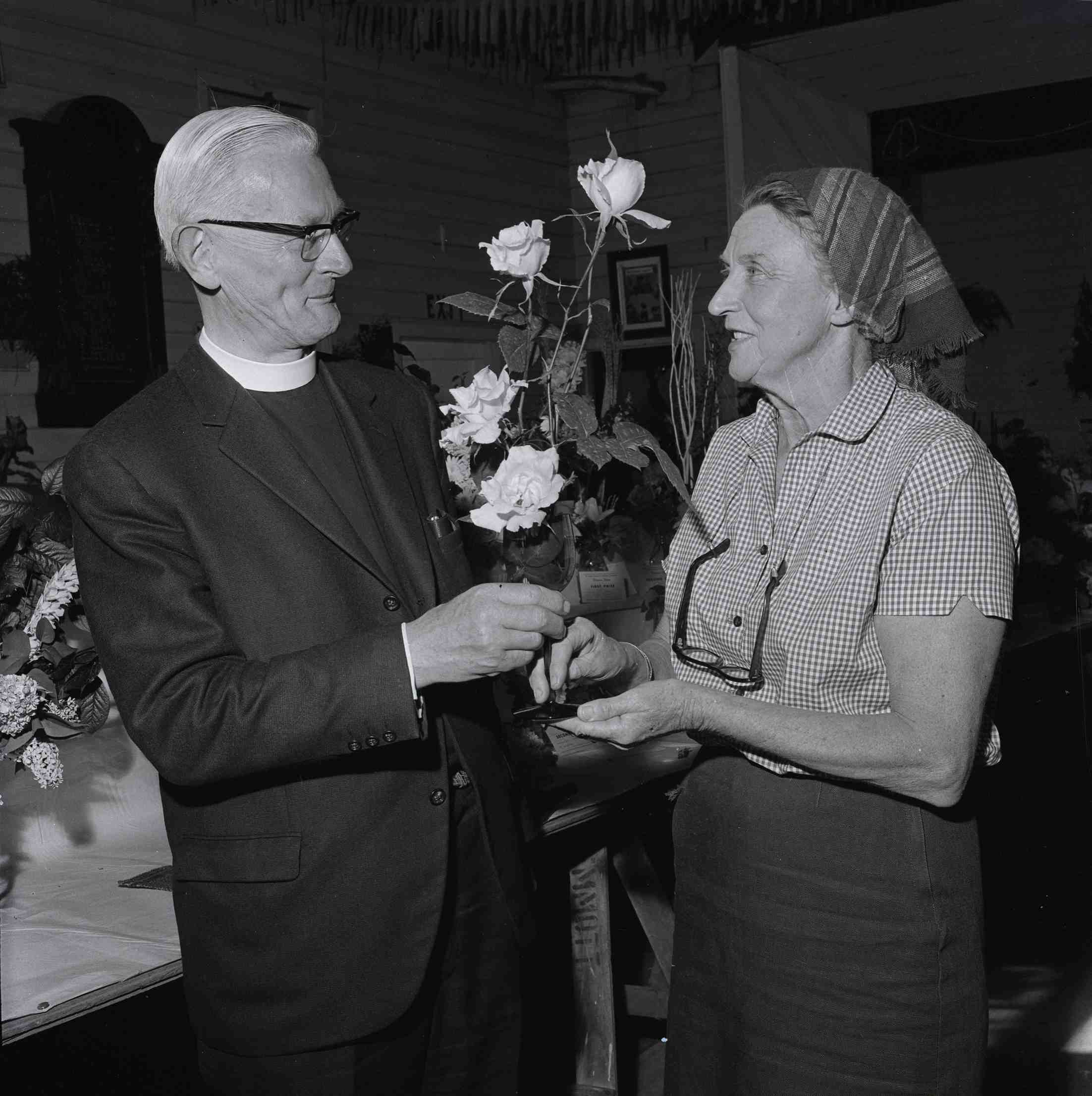 A clergyman and a fwoman inspecting an arrangement of roses.