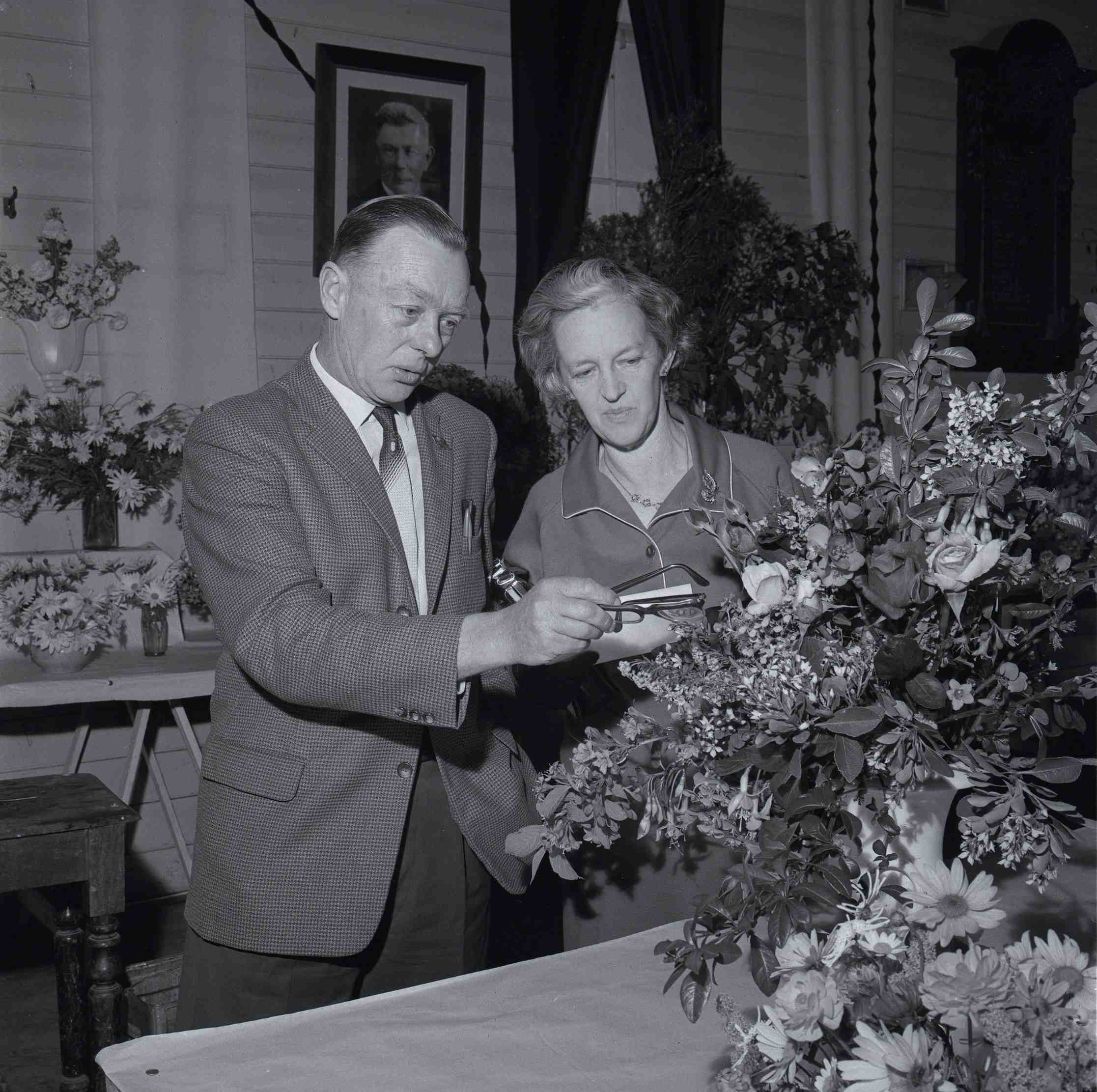 Mr Klein and Marjorie Klein of Red Hill judging at a Balnarring Flower Show in the old pre 1969 Balnarring Hall.