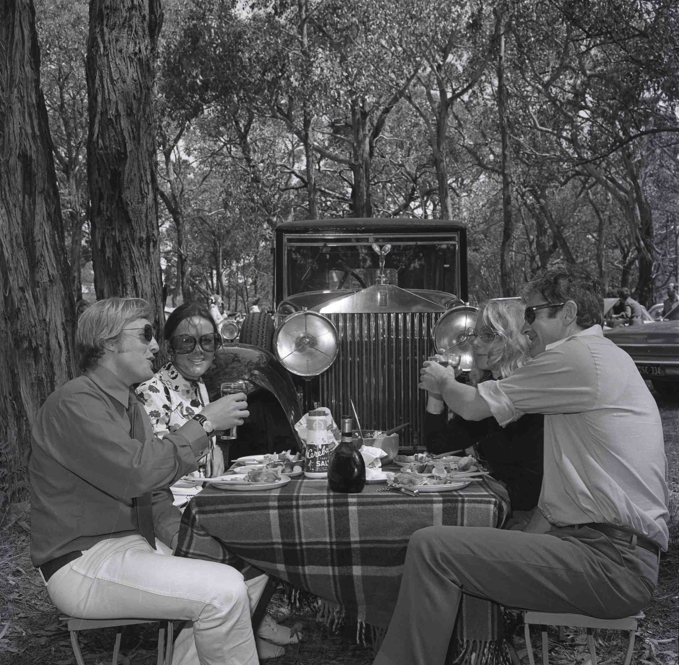 Picnickers at Emu Plains Racecourse with an old Rolls Royce car.