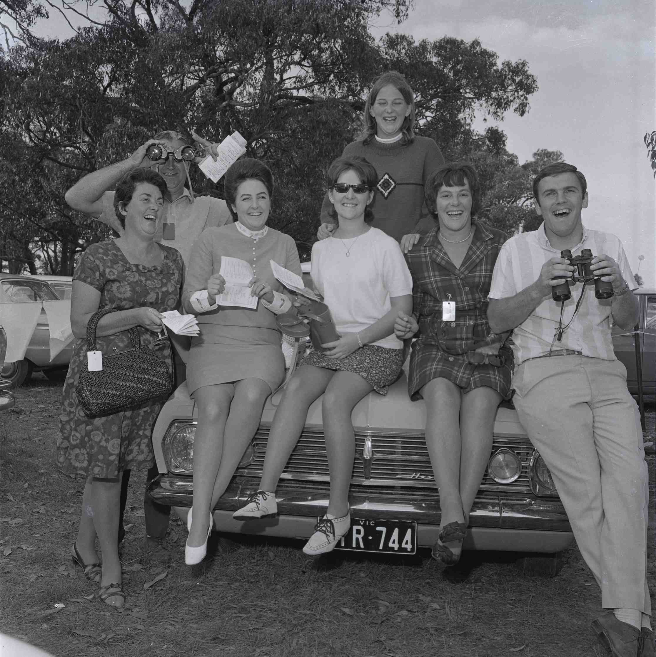 A group of people sitting on a parked car during Balnarring Picnic Races at Emu Plains Racecourse.