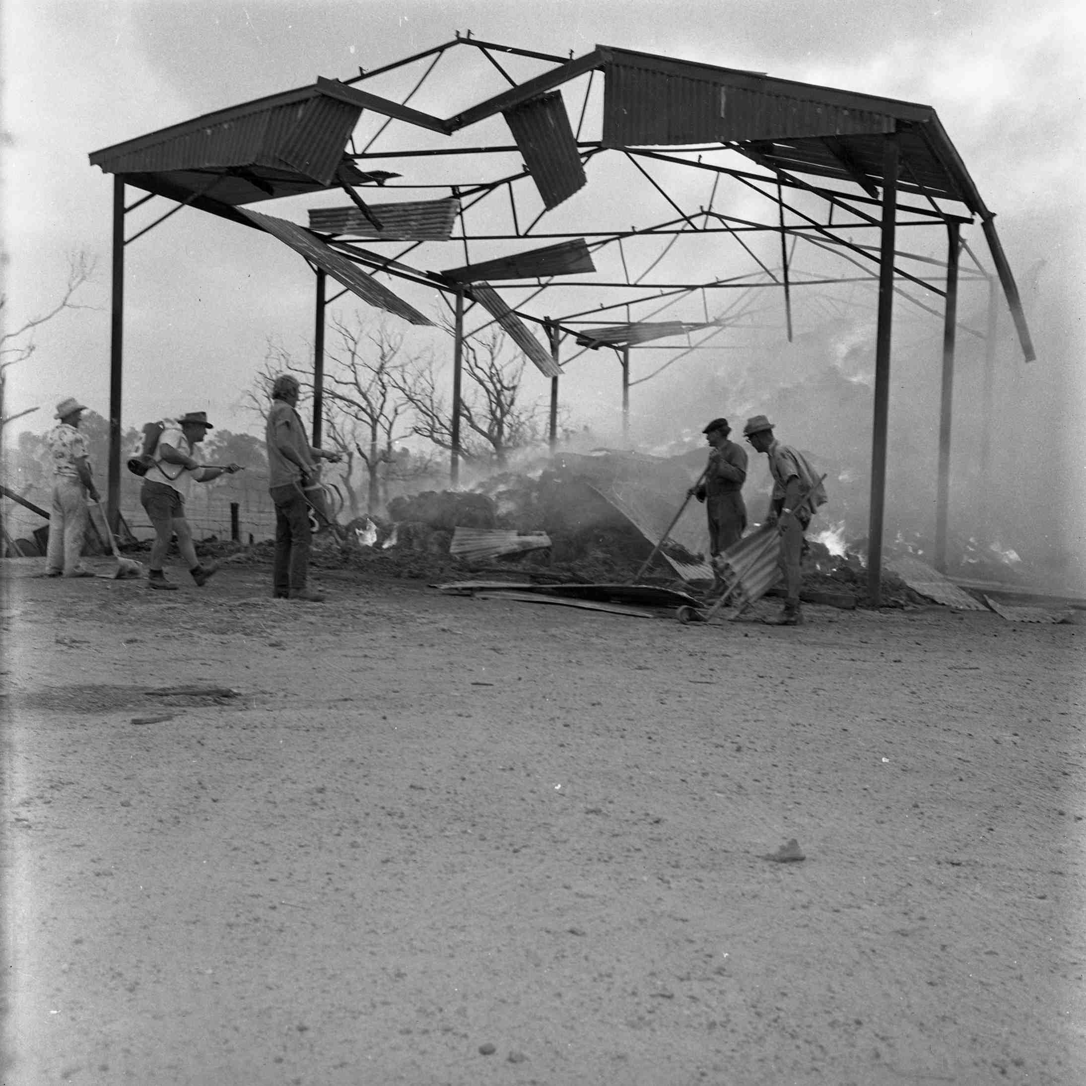 Men with firefighting equipment at a burnt out shed frame.