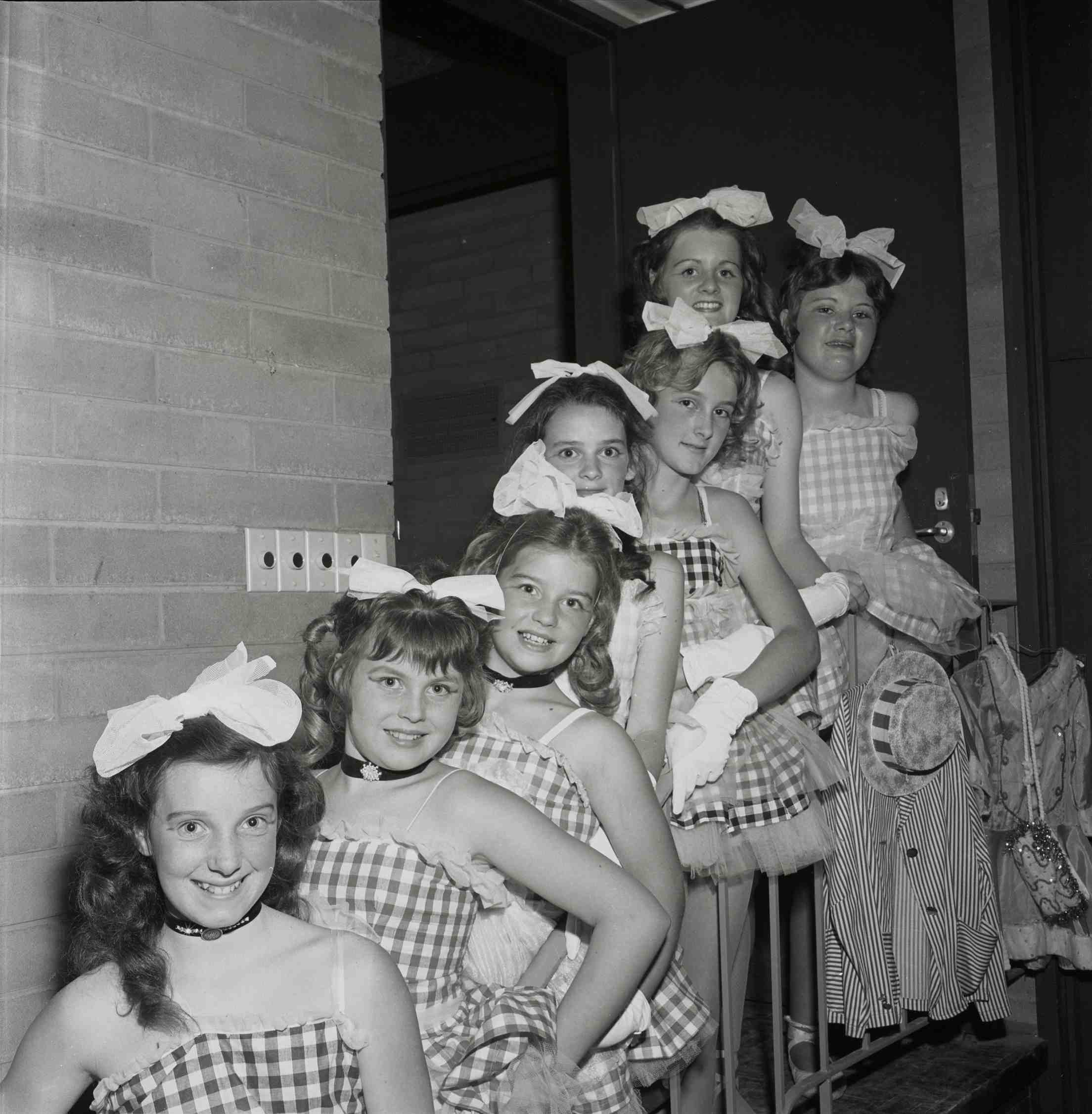 DESCRIPTIONSeven young girls dressed in gingham dancing performance costumes, posing for a photograph.