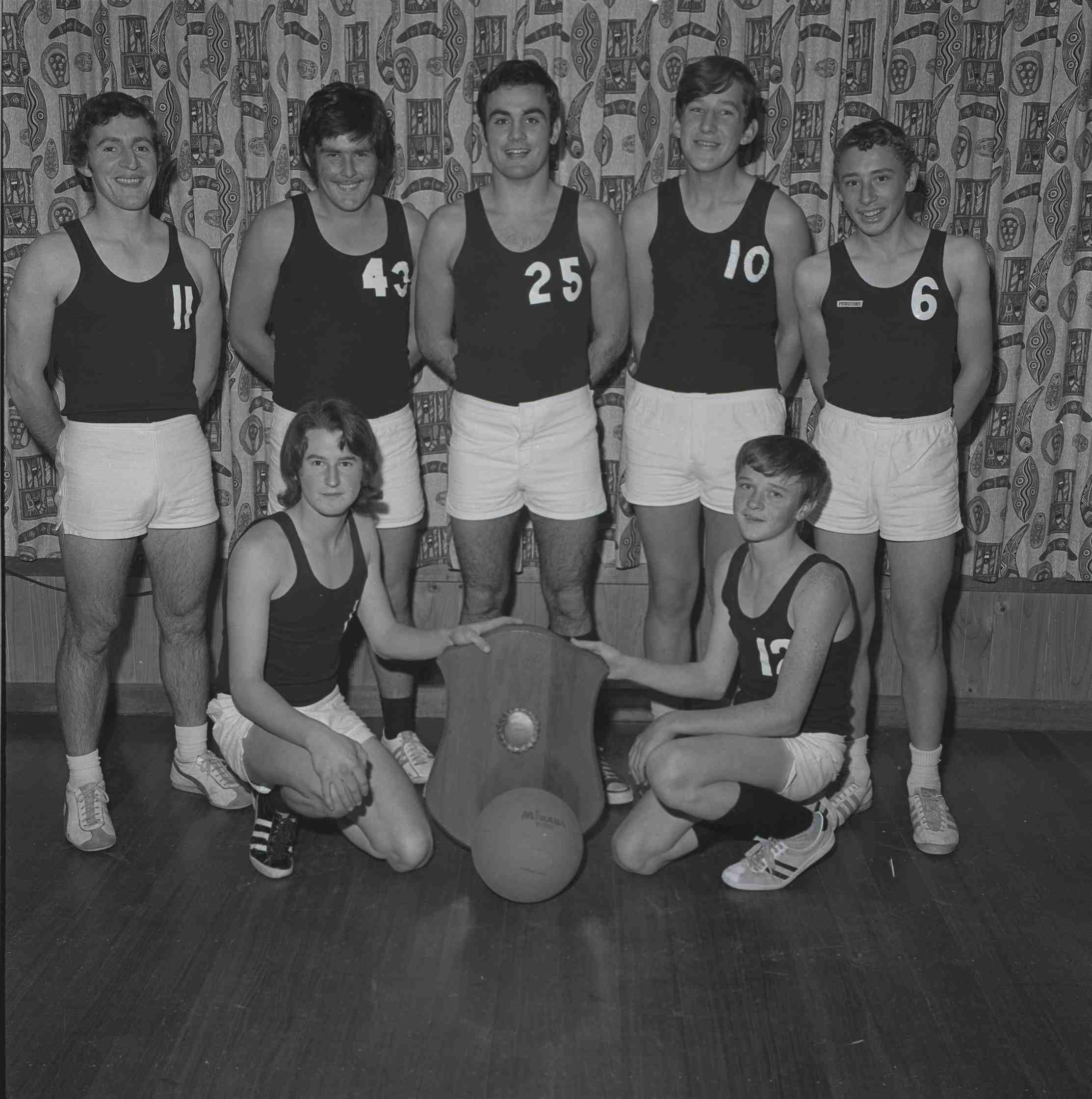 Mixed male and female Basketball Team. Back Row L to R: Ian Rolland, Robert Lothian, Frank Johnston, Robert Martin, Bruce Manly, Bottom Row L to R: Terry Walles, Dale Anderson.