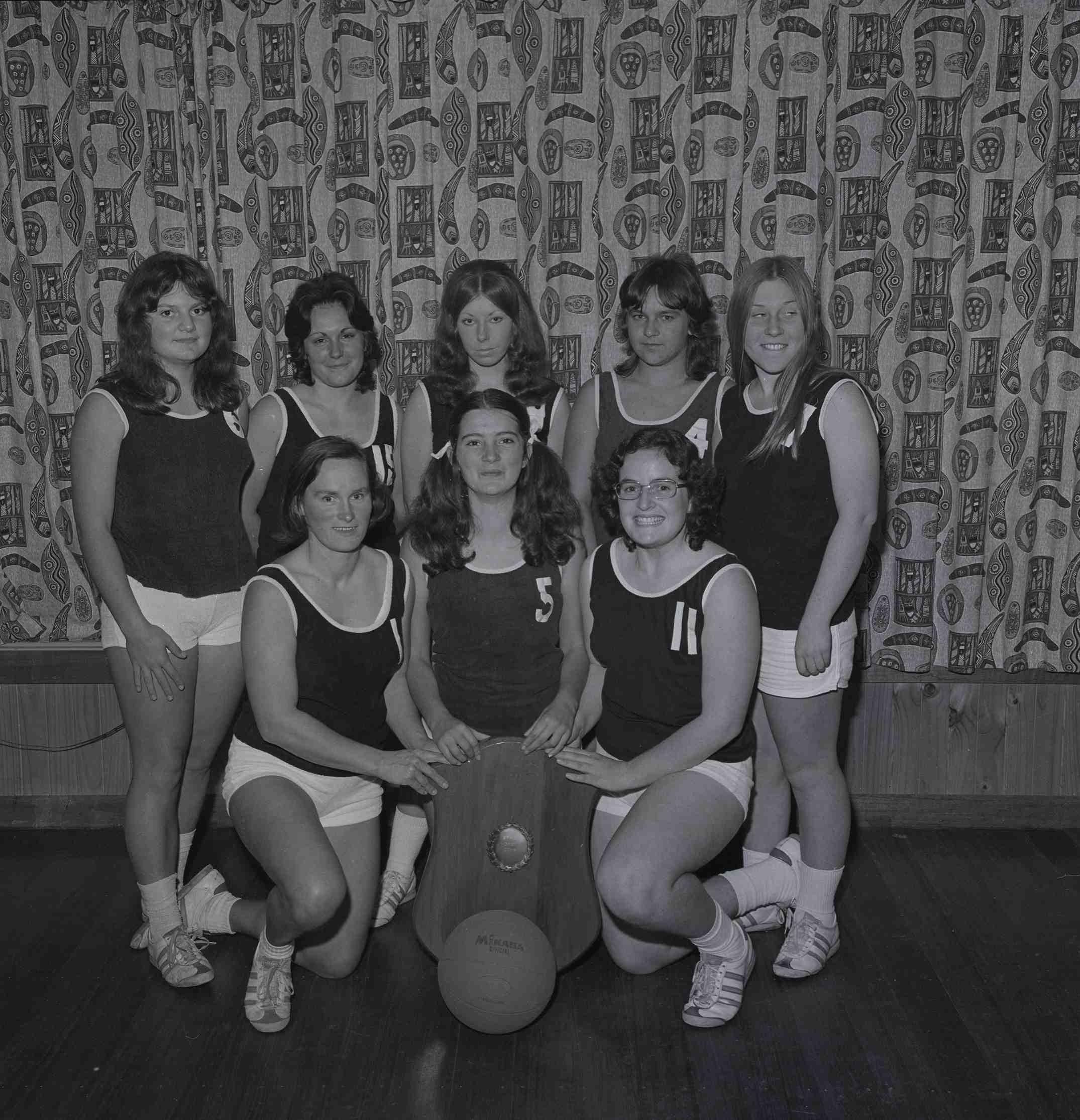 A Basketball Team of eight girls posing for group photograph. Back row | L to R: Marian Sniczer | Pam Kealy | Helen Wallace | Chistina Porajski | Kerry Phylano date. Front row L to R: Oriel Schosser | Rita Glover | Chery Rollano date.