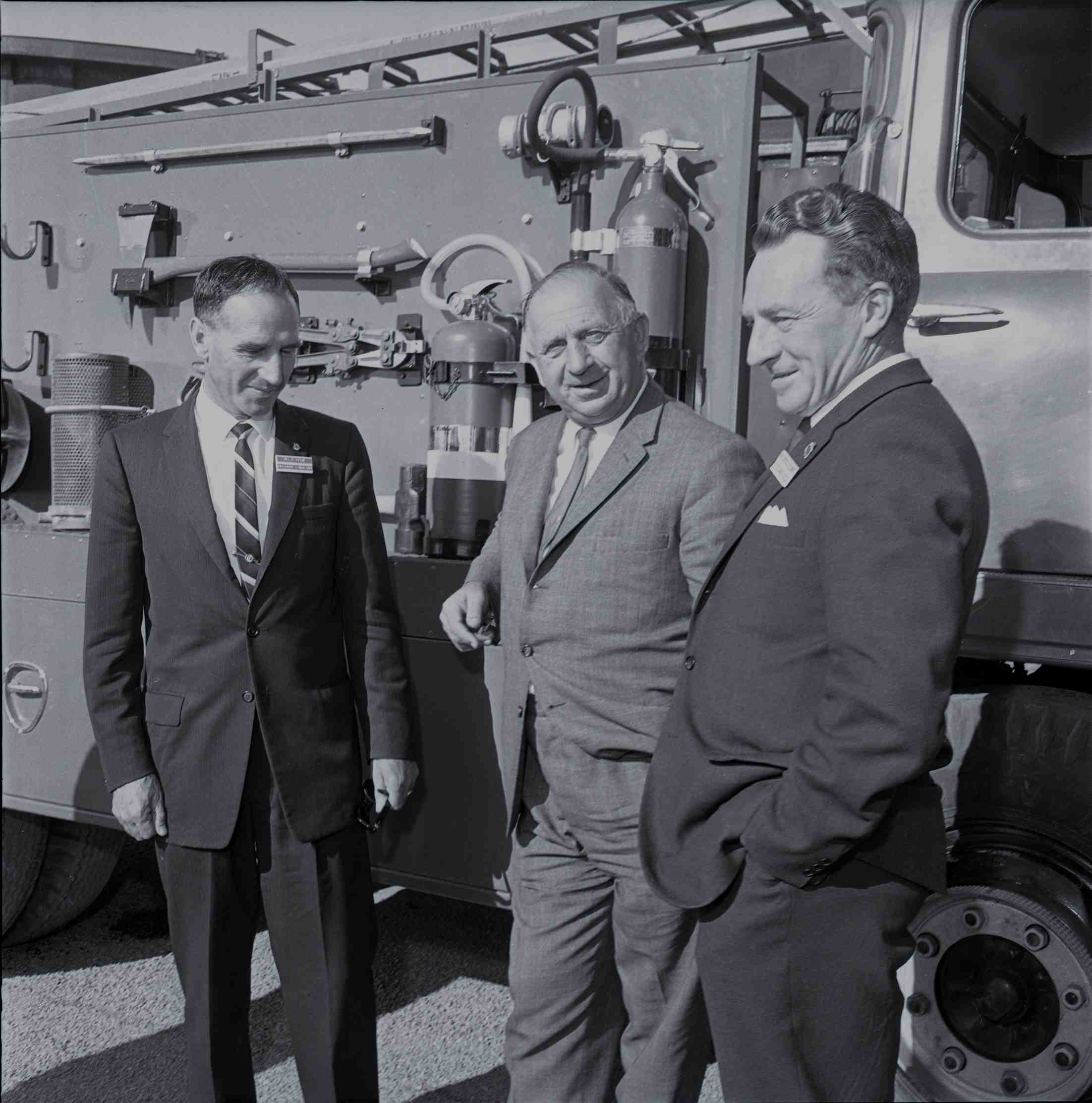 Jim Peyton | Henry Bolte Premier of Victoria | Lance Walker against the background of a fire truck while on a visit to either the Esso Refinery site in Hastings.