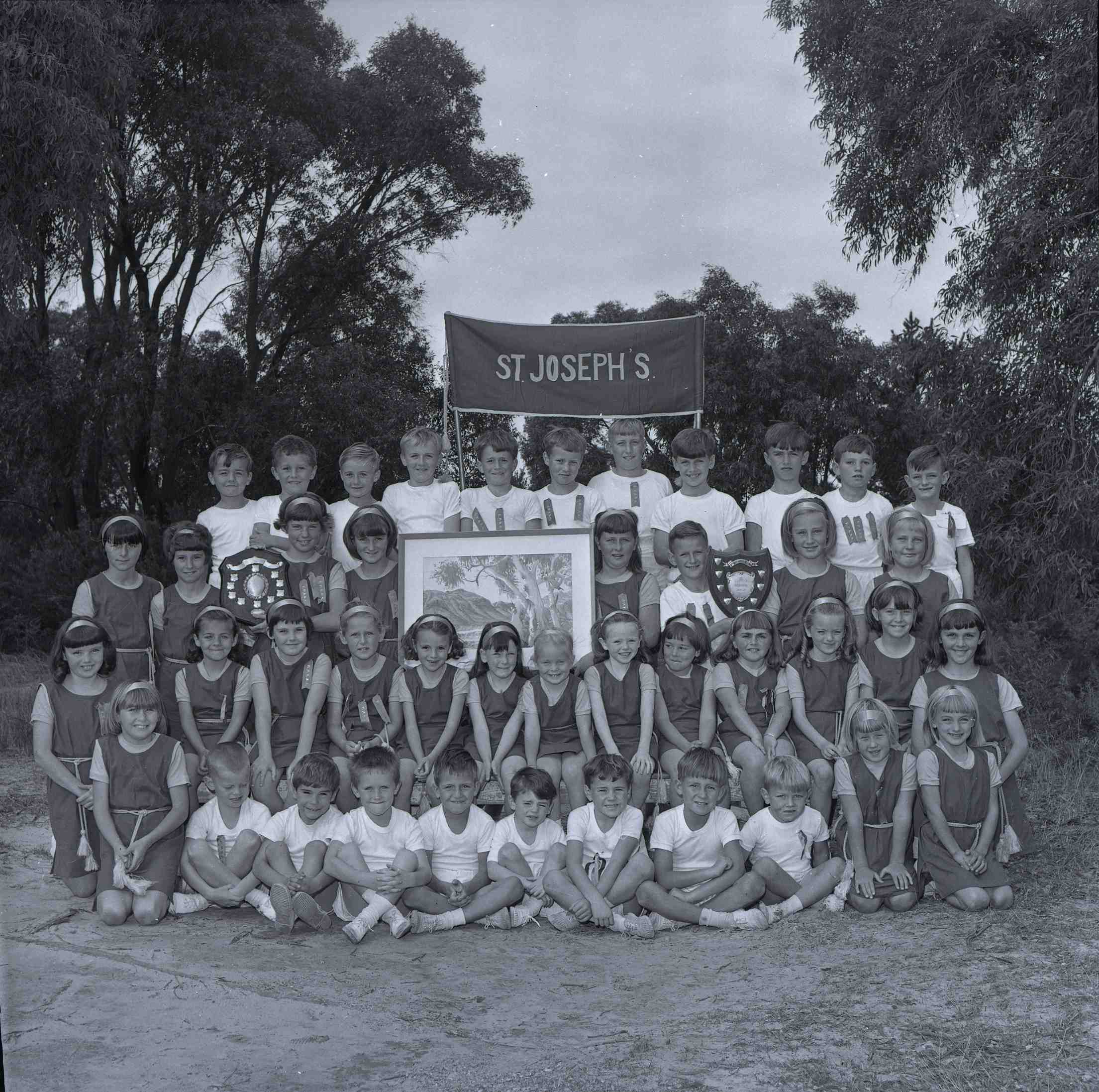 St Joseph’s Primay School students with a trophy for gaining the inter school sports championship.