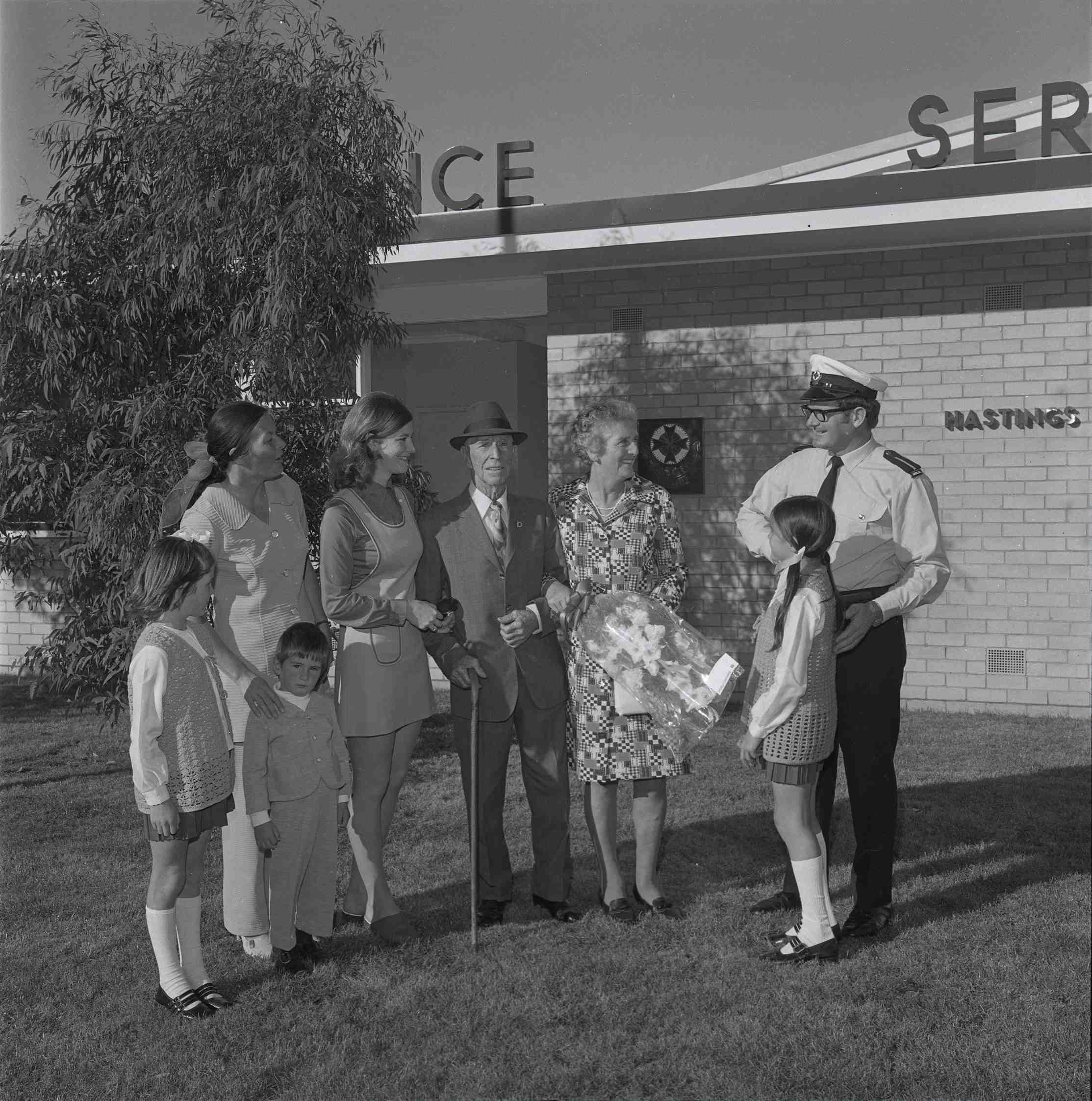 HISTORYA group of seven adults and children talking to an ambulance officer on the day of opening of the new Hastings Ambulance Station.