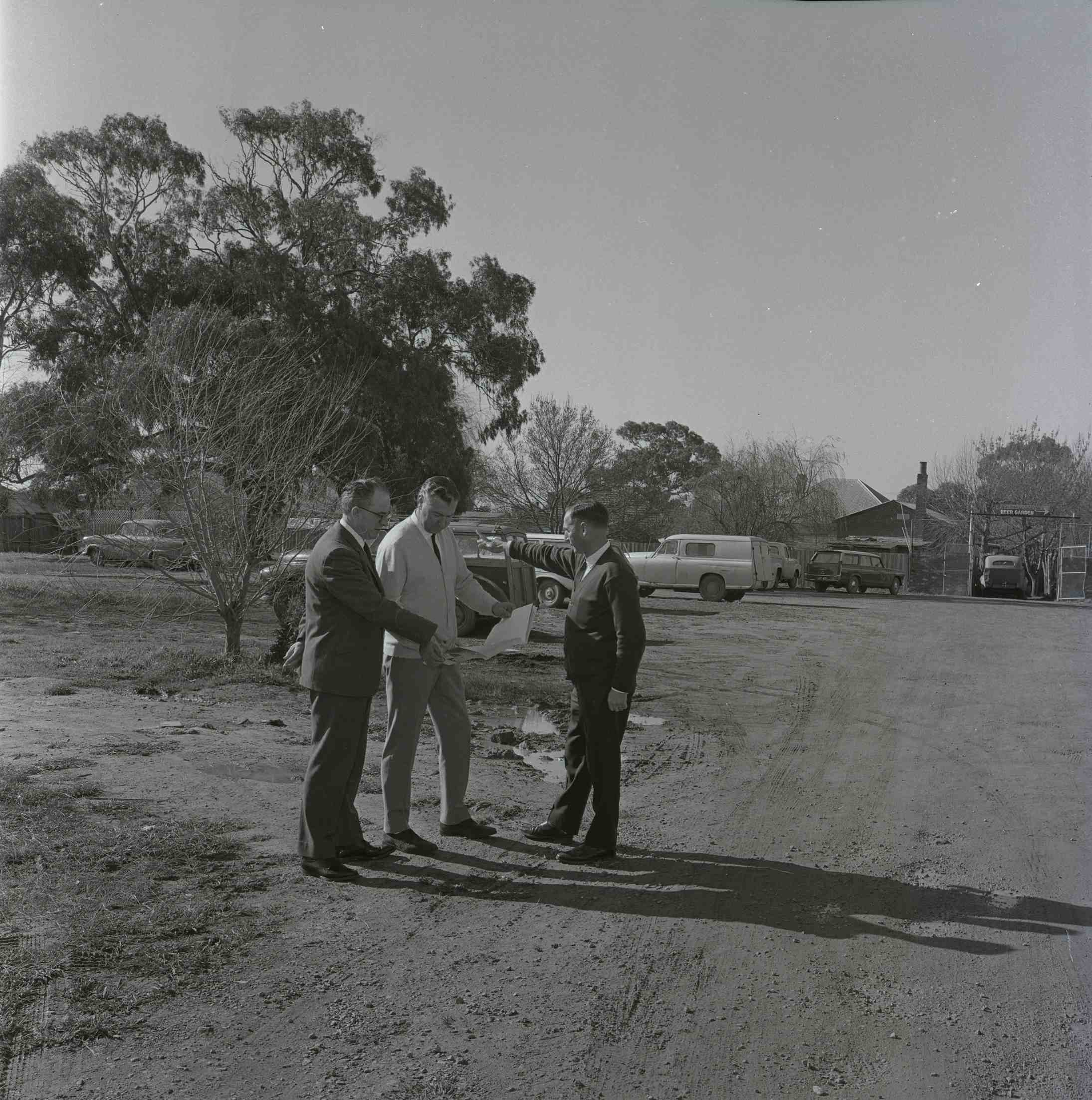HISTORYPlans for the car park at Coles supermarket being inspected by Jim Riley, Hastings Shire Engineer and Cr Jim Paton.