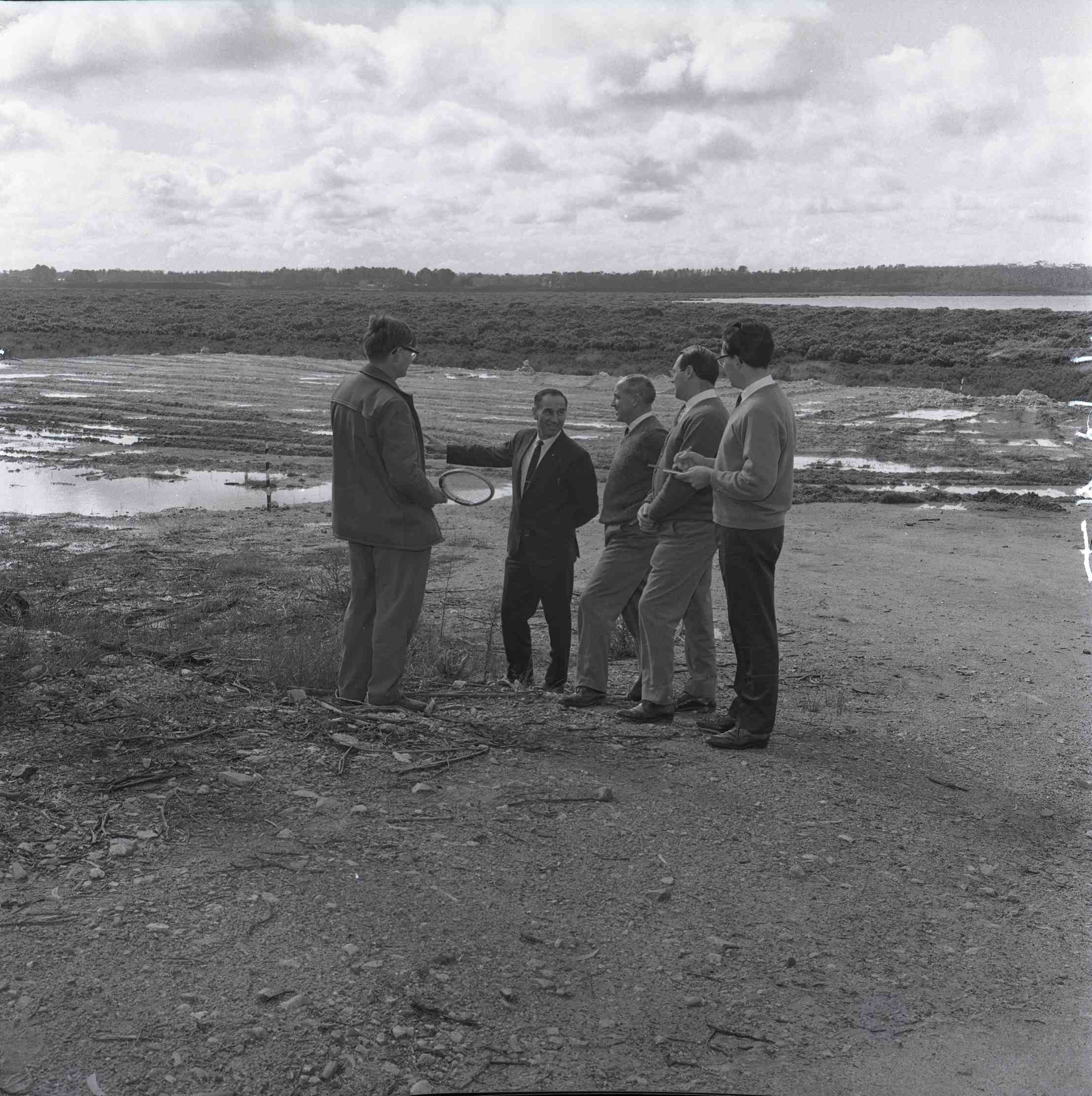 Discussion re the siting of the Hastings Tennis Courts on the foreshore landfill which was once a mangrove flat. Rev. Peter Kissick, Jim Payton, Jack Babbington, Gordon Gray, Brian Stahl.