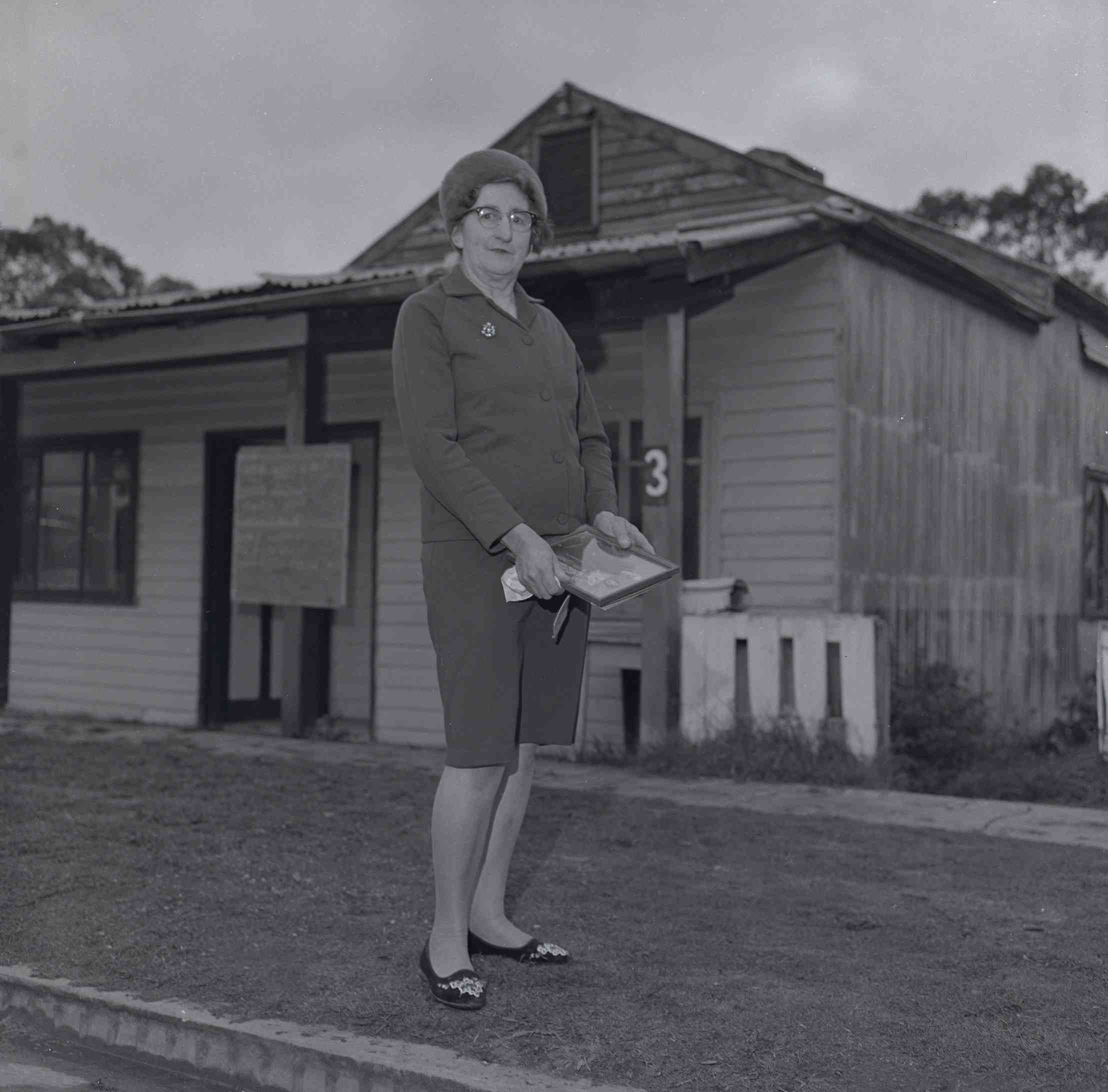 A Woman dressed in a (skirt) suit near a footpath front of a weatherboard house with a notice in front. The woman is holding a framed photograph of a man and a Woman.