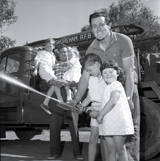 In front of a fire truck at the Shoreham CFA building one man is holding two young children in his arms and another man is leaning over a boy and a girl. The boy is holding a running fire hose.
