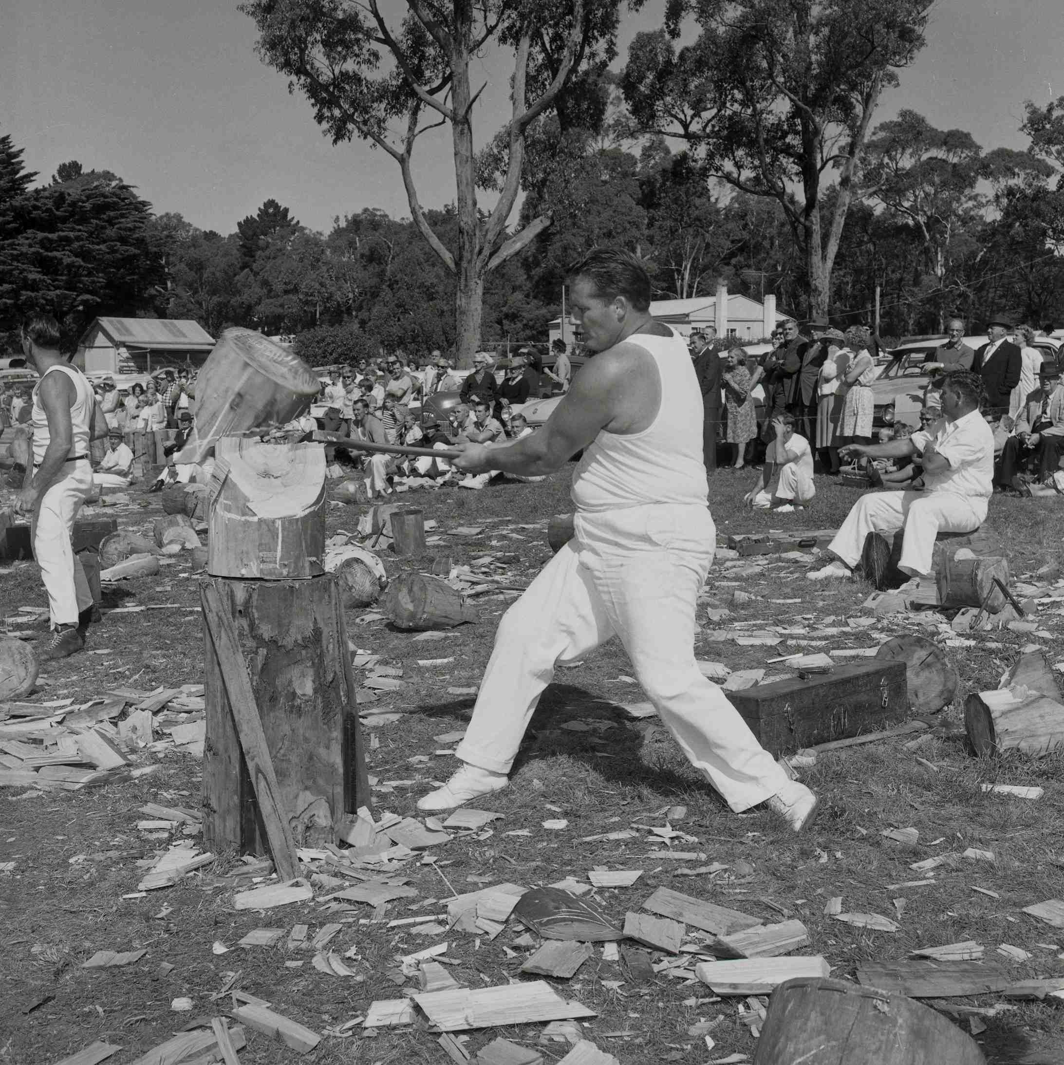 DESCRIPTIONRed Hill Show Woodchopping event . A man in a singlet swinging an axe at a log.