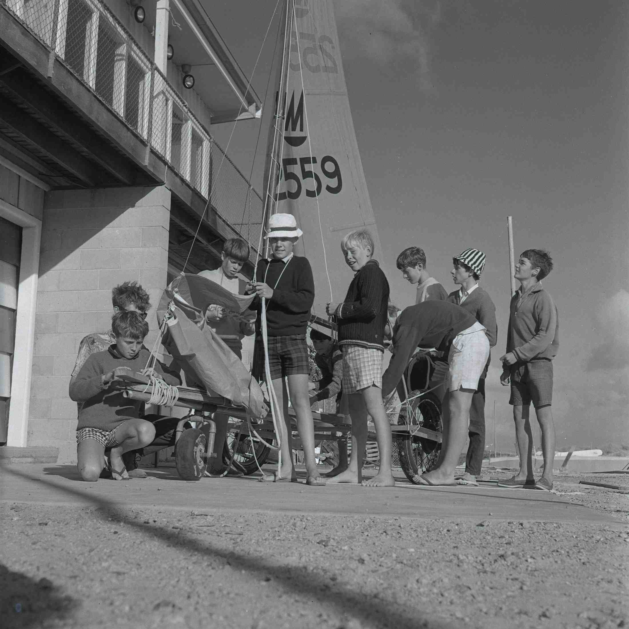 A group of the Younger Set of the Yacht Club building a land yacht using a ‘Mirror Class’ sail. Those responsible for this project were John Kelly in white hat, Greg Otto, Bruce Harrison, and Peter Hayes.