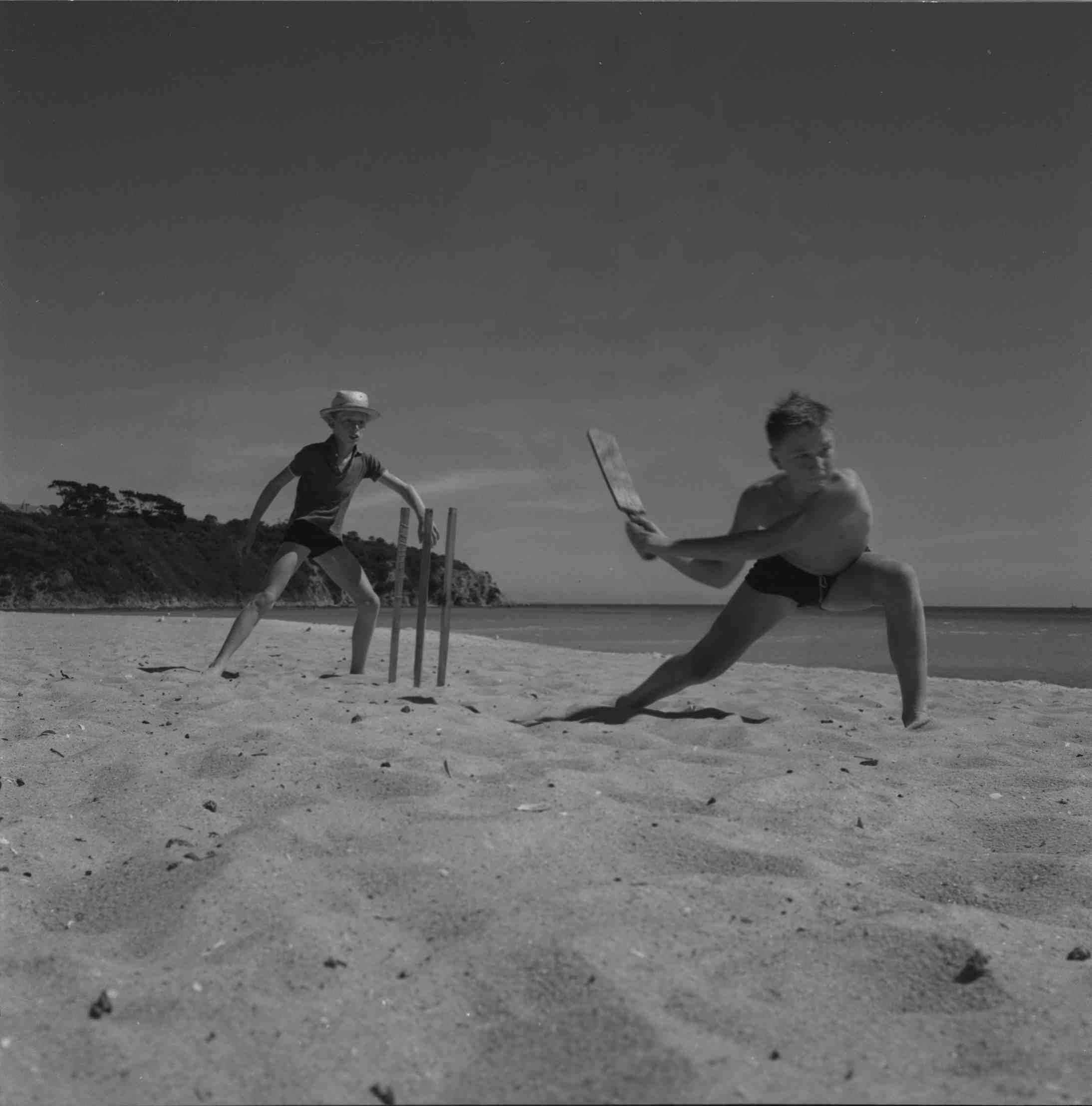 Two young boys playing cricket on the beach. One is swinging his bat, the other is minding the stumps.