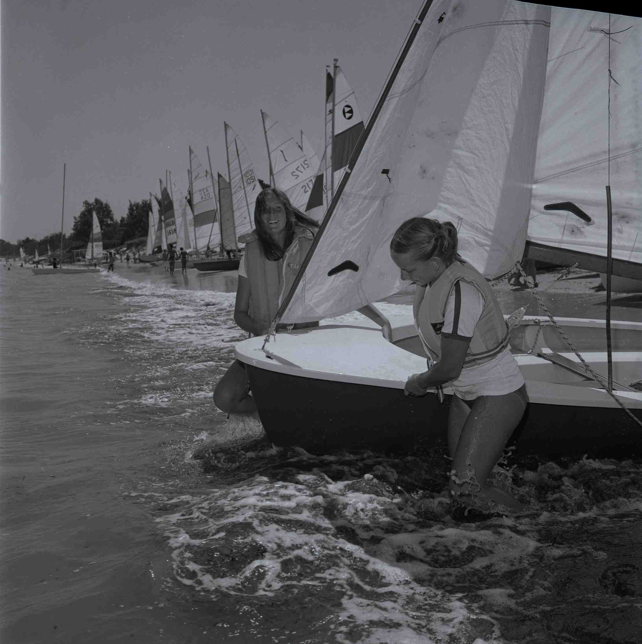 DESCRIPTIONA row of yachts and people on the water line . In the foreground two young women are pulling a yacht into the water.