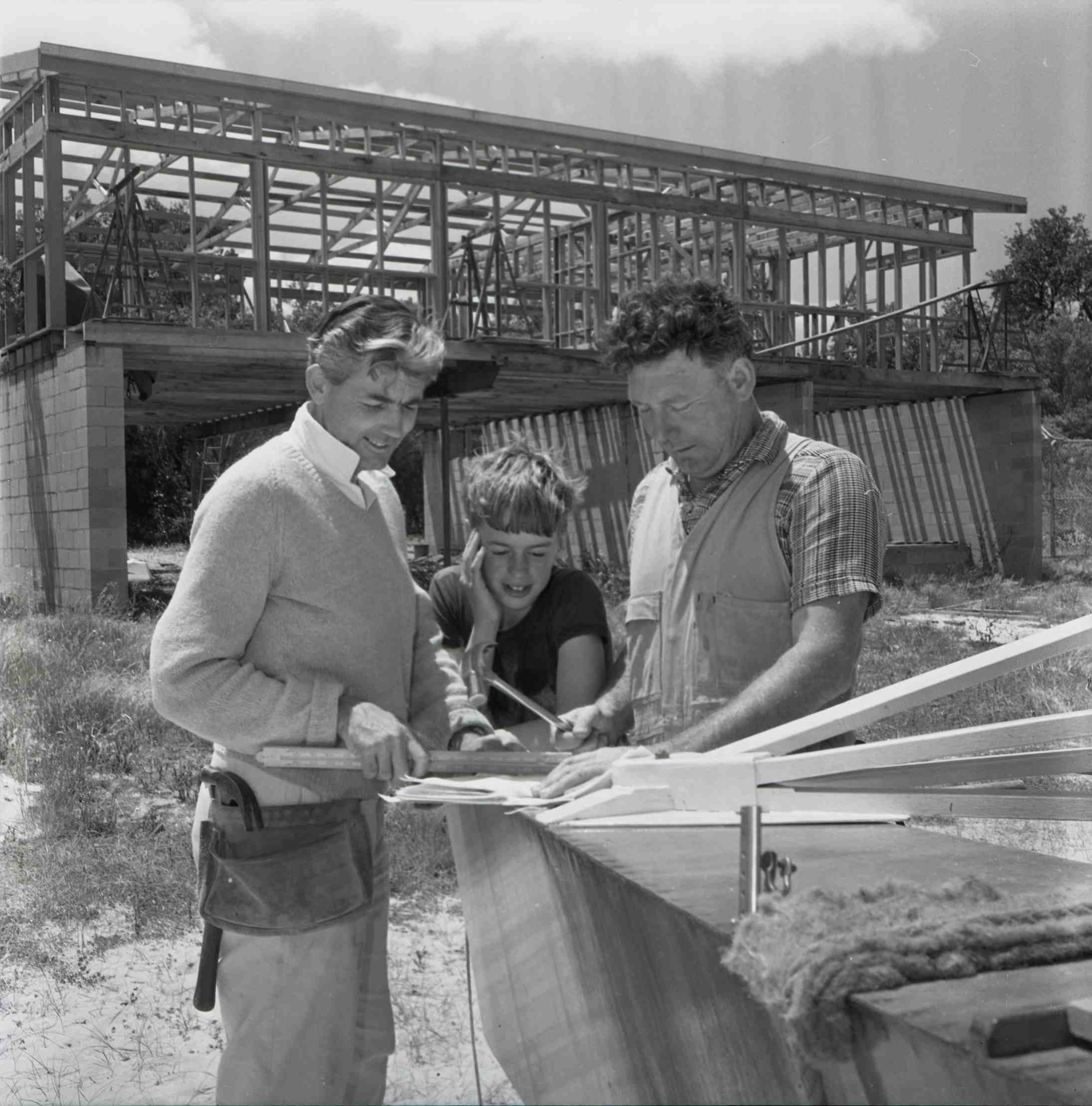 DESCRIPTIONTwo men and a boy discussing plans which are laid out at an outdoor bench. A partly constructed two story building is in the backgrouno date.