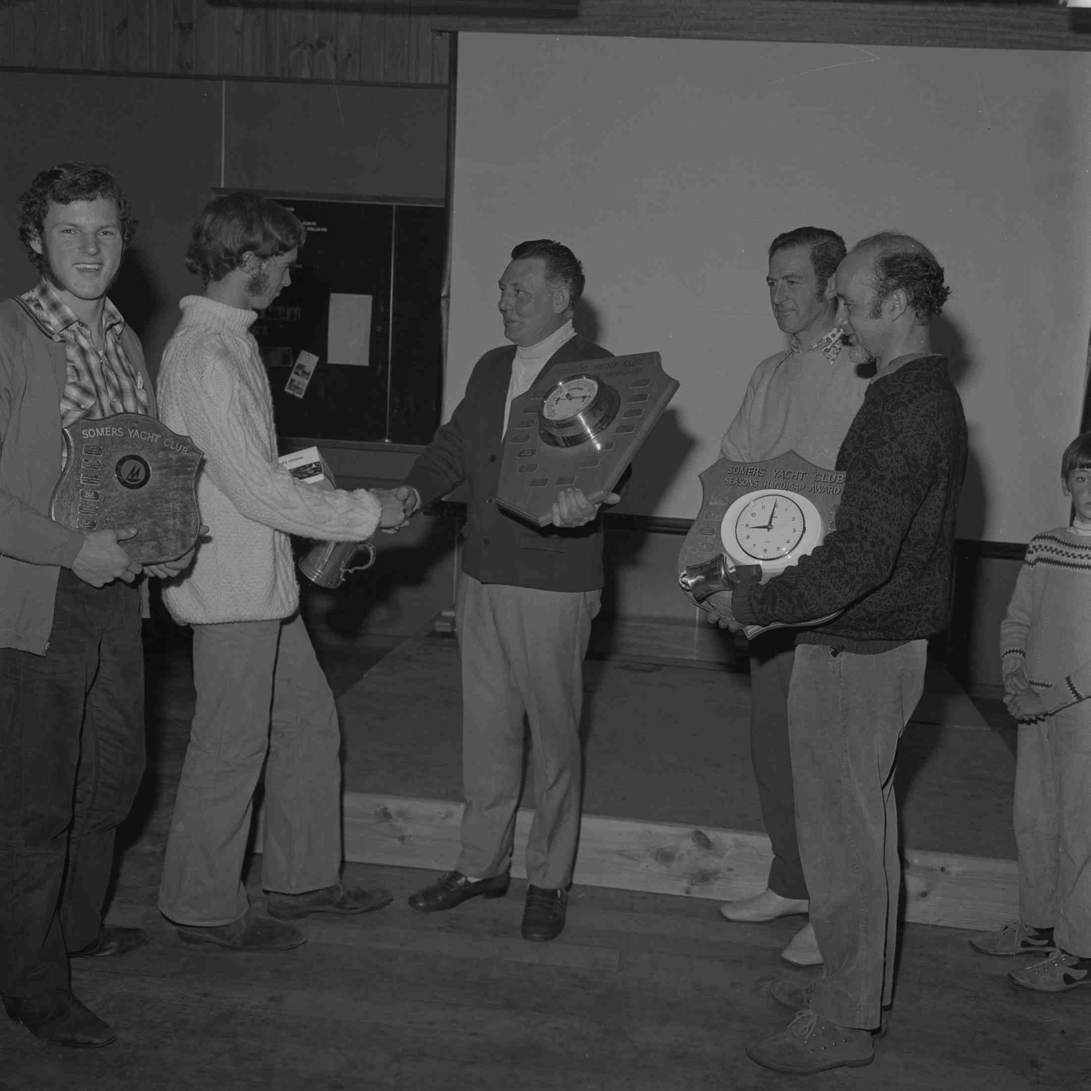 HISTORYPresentation night at Somers Ycht Club: L to R Tedd Warden, David Williams, Commodore Ron Fitzgerald, Ian Brock, John Williams.