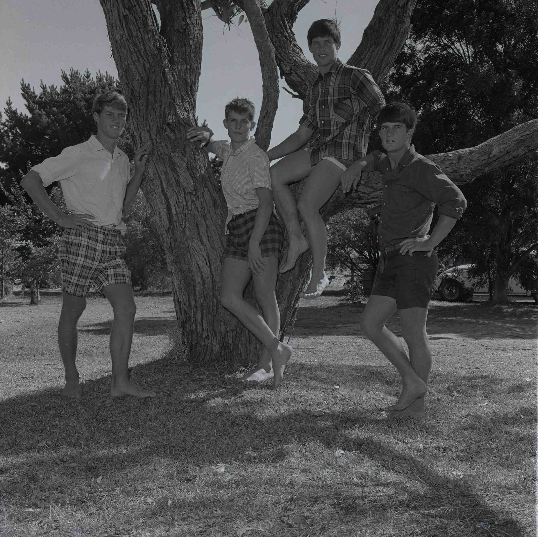DESCRIPTIONFout teenage boys posing for the photograph around the branches of a tree.