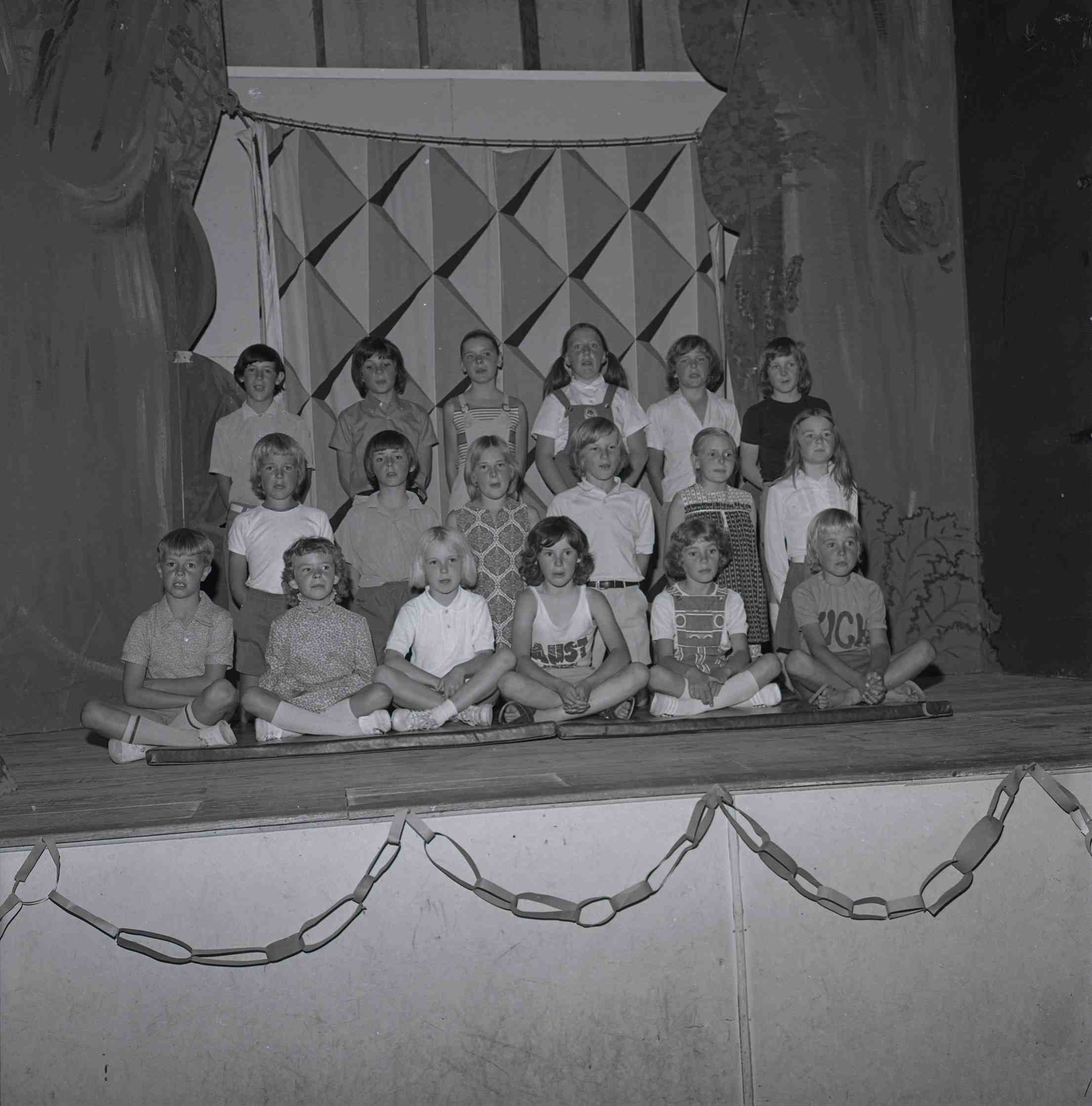 DESCRIPTIONEighteen school children llined up in three rows sitting, kneeling and standing on a stage.