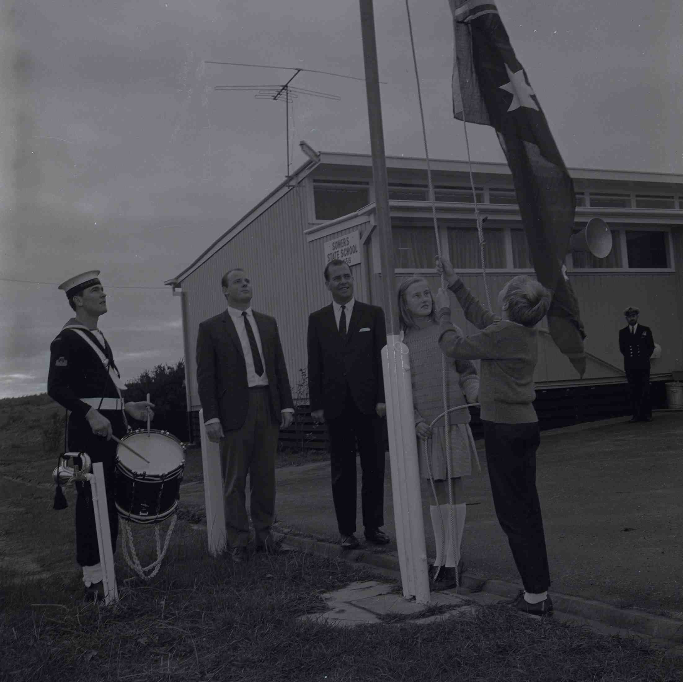 DESCRIPTIONNear a school building a boy and girl are raising a flag while two men and a RAN drummer stand by.