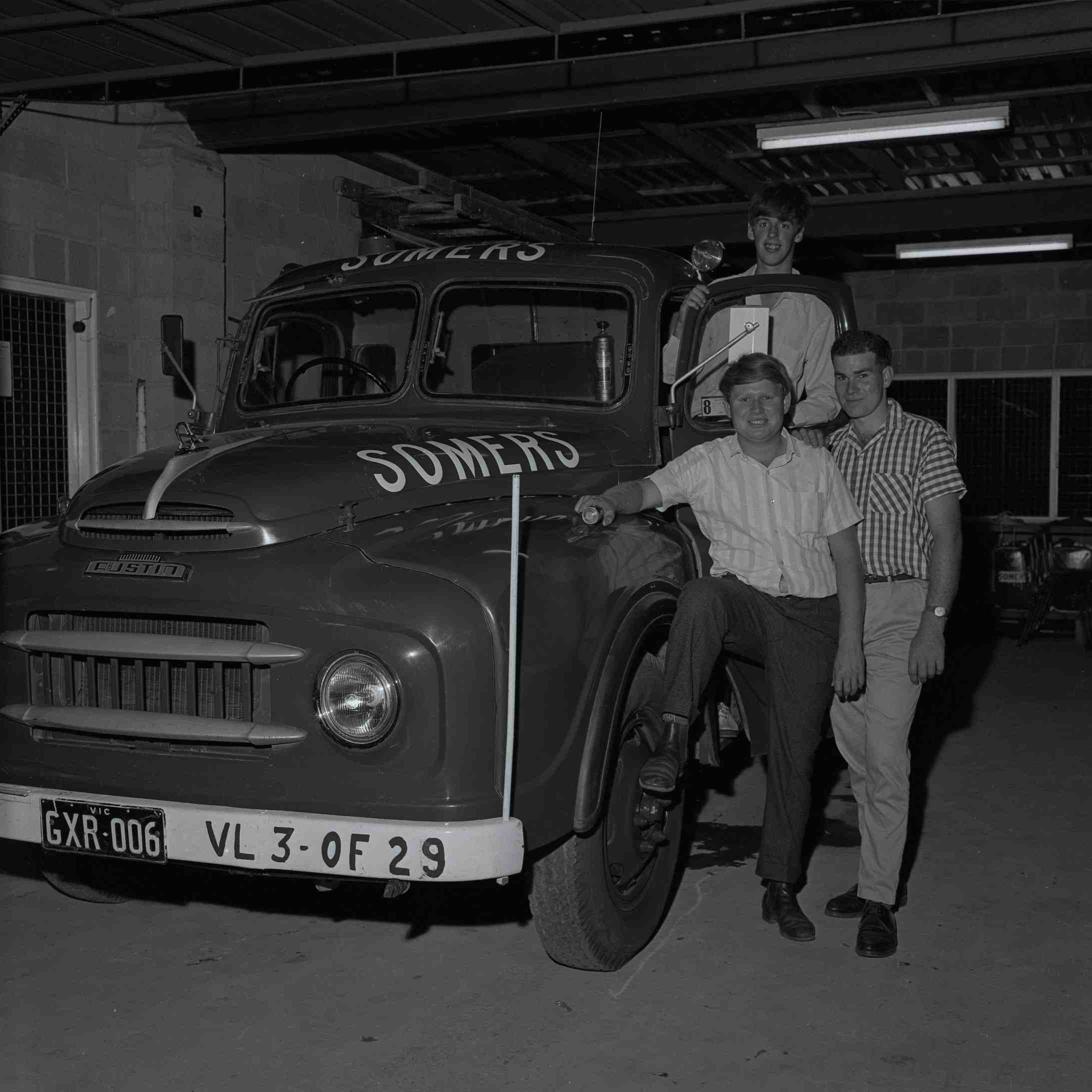 DESCRIPTIONThree young men posing at an Austin truck with ‘Somers’ signage on the front of the roof and on the bonnet.