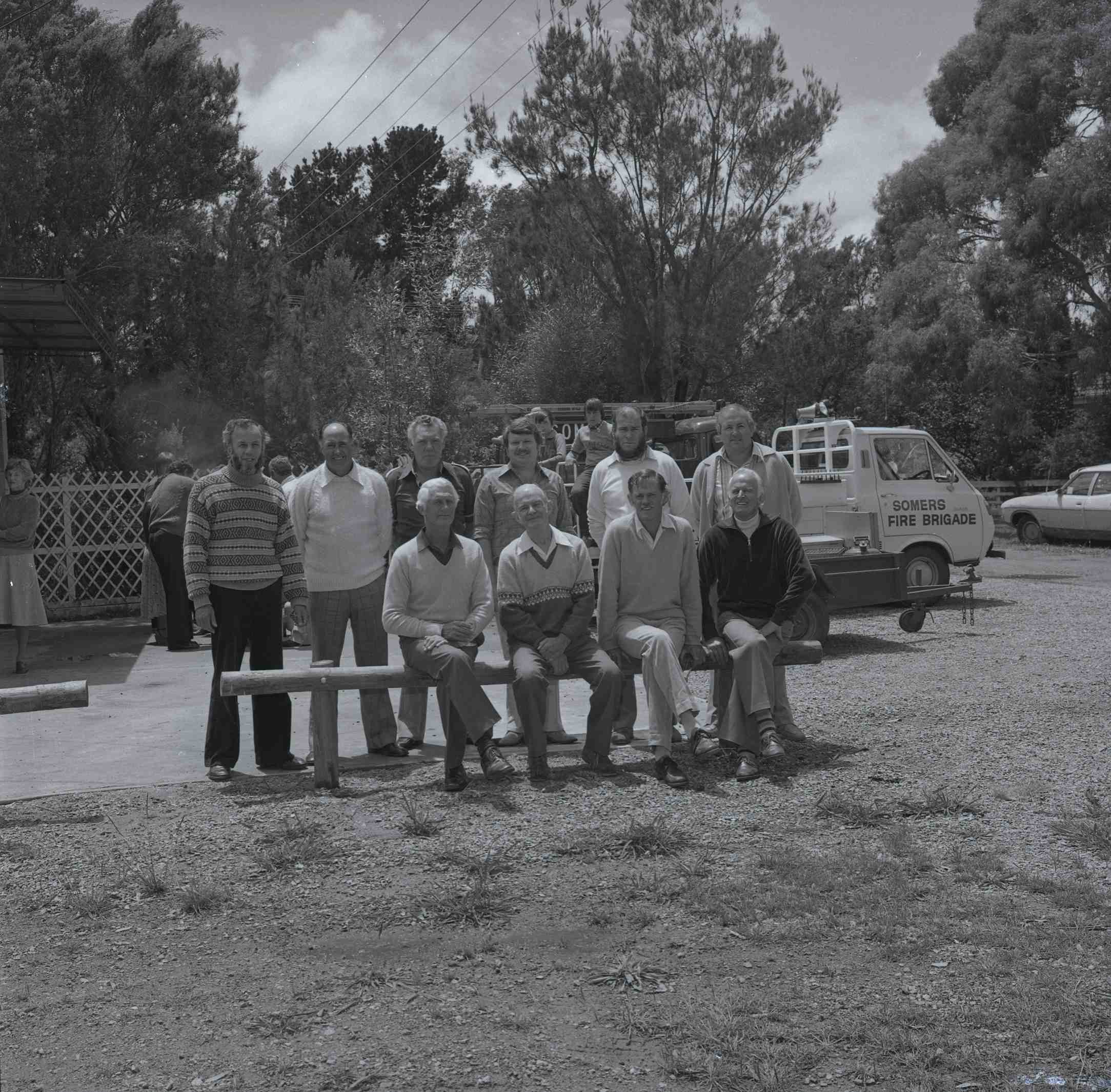 DESCRIPTIONTen men in two rows, four sitting on a timber barricade and six standing behino date. Other people are in the backgrouno date. A white small truck sith signage reading ‘Somers Fire Brigade’ behind the men.
