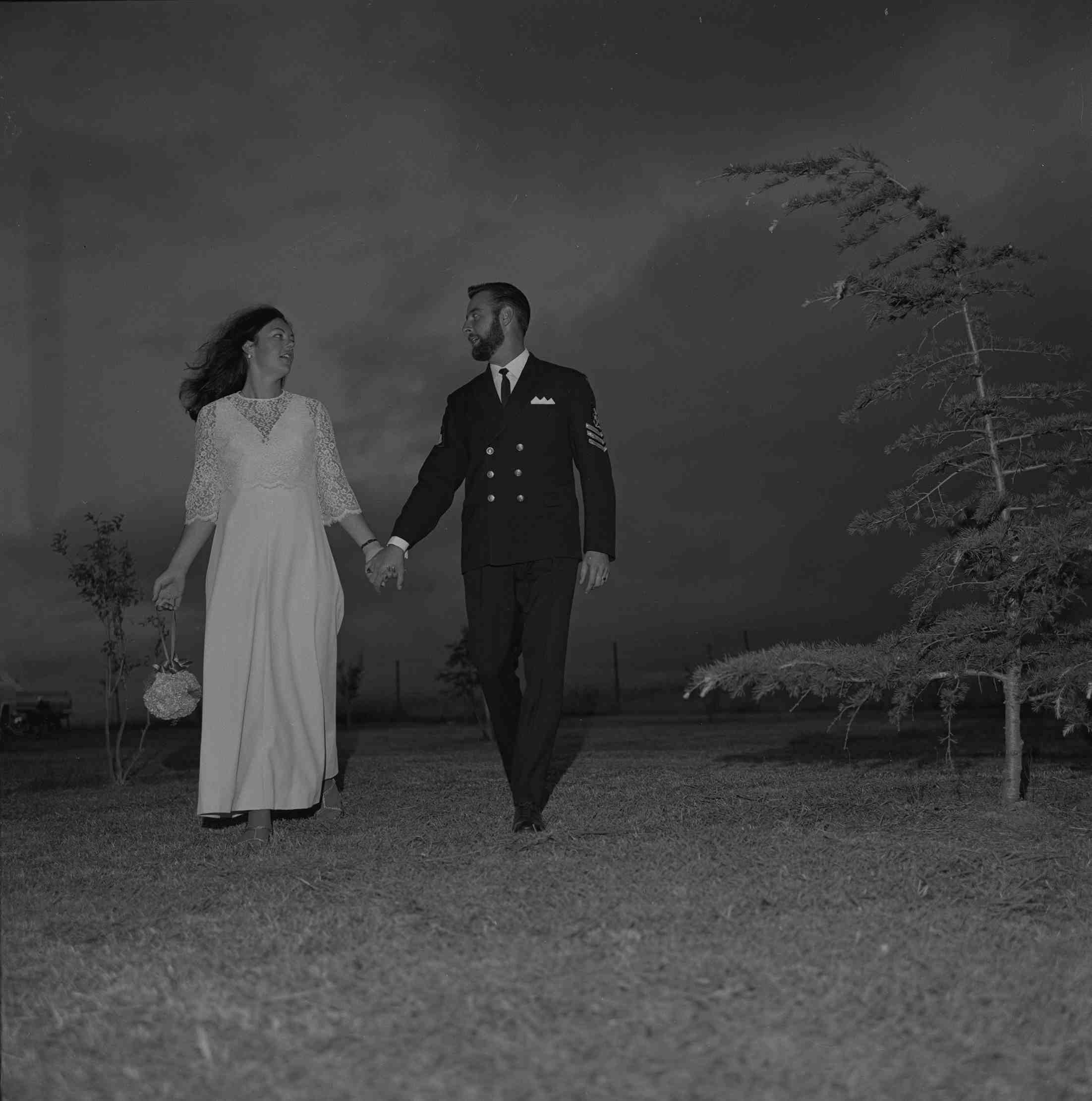 DESCRIPTIONWoman in qa long pale frock and man in RAN uniform holding hands in an outdoor setting at night. A young pine tree is bending with the wind on the right.