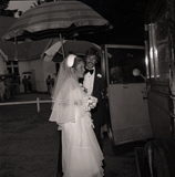 DESCRIPTIONBridal couple at an open car door. People and a weatherboard church building ar in the backgrouno date.