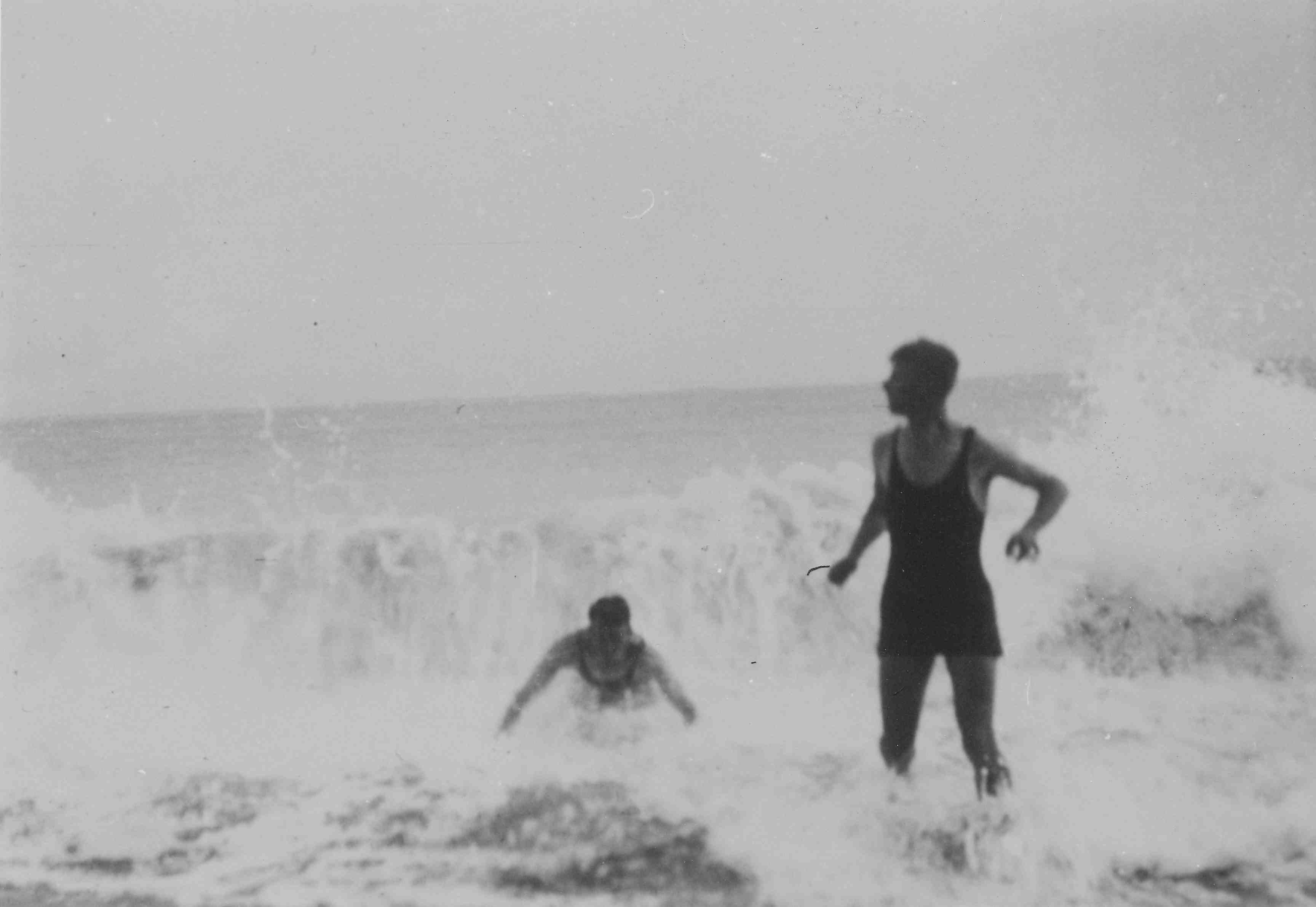 DESCRIPTIONBeach at Merricks. Surf breaking at end of beach. Two male figures surfing. Central figure is prone, supported by arms. R.H. figure standing ankle deep in water wearinbg one piece 20’s style bathing suit.