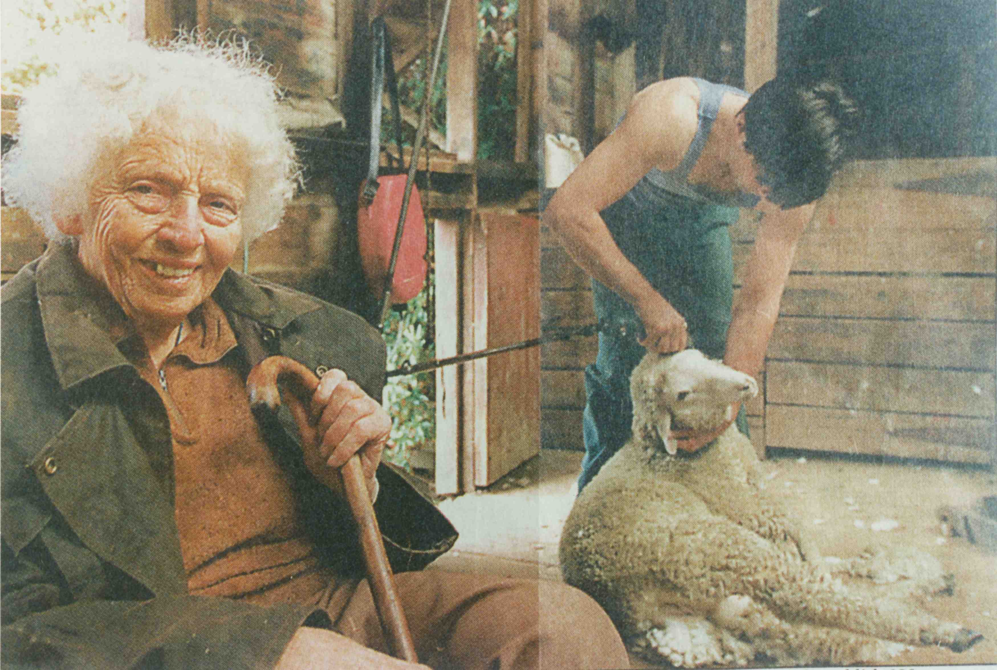 HISTORYMerricks 1995. Phyllis Cole with Peter Bell (manager) shearing. The photo was on the front page of ‘The Age’ newspaper after the event ‘Larnoo Experience’.