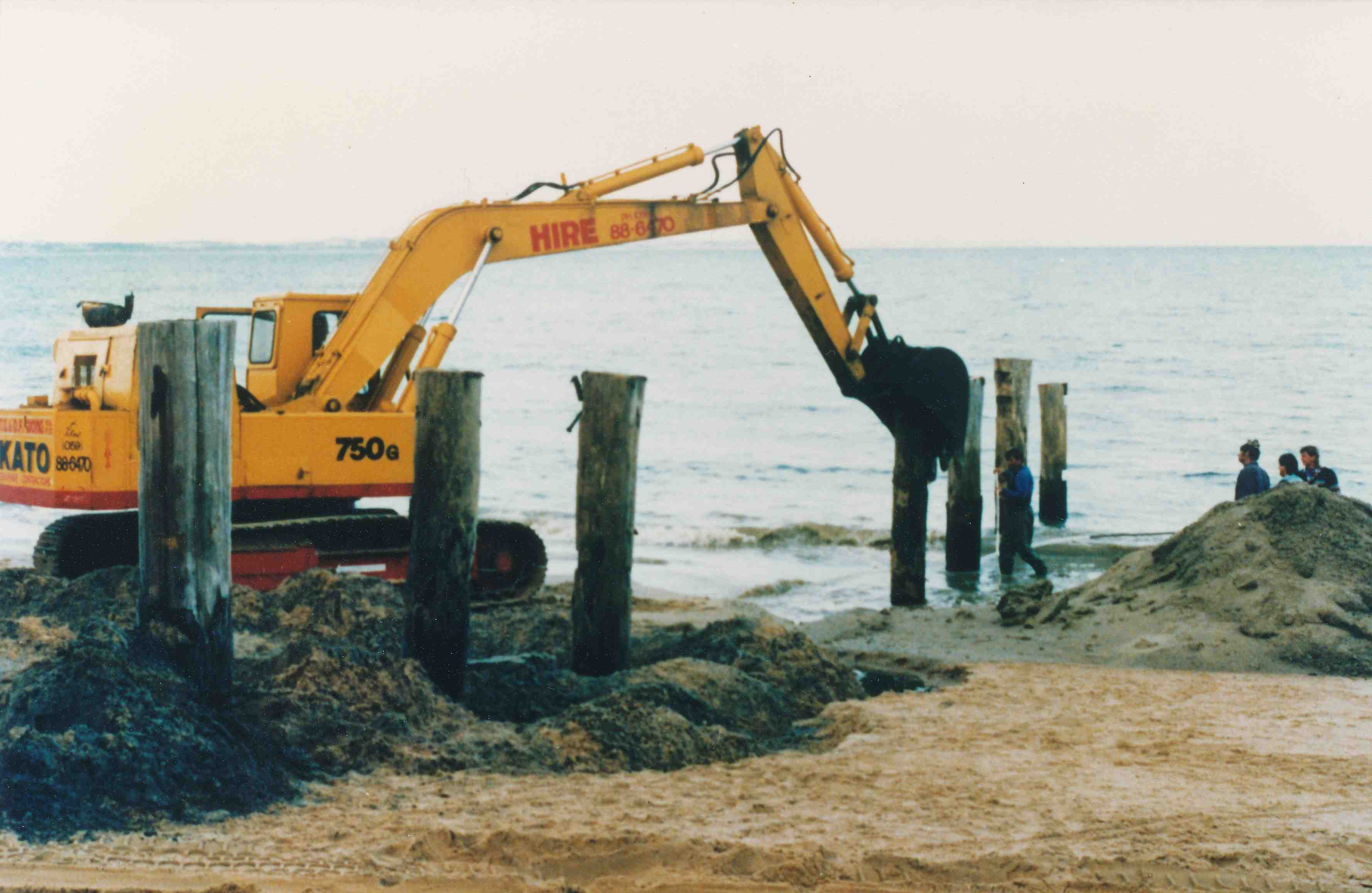 Somers c.1991. Beach erosion being cleared using an excavator.