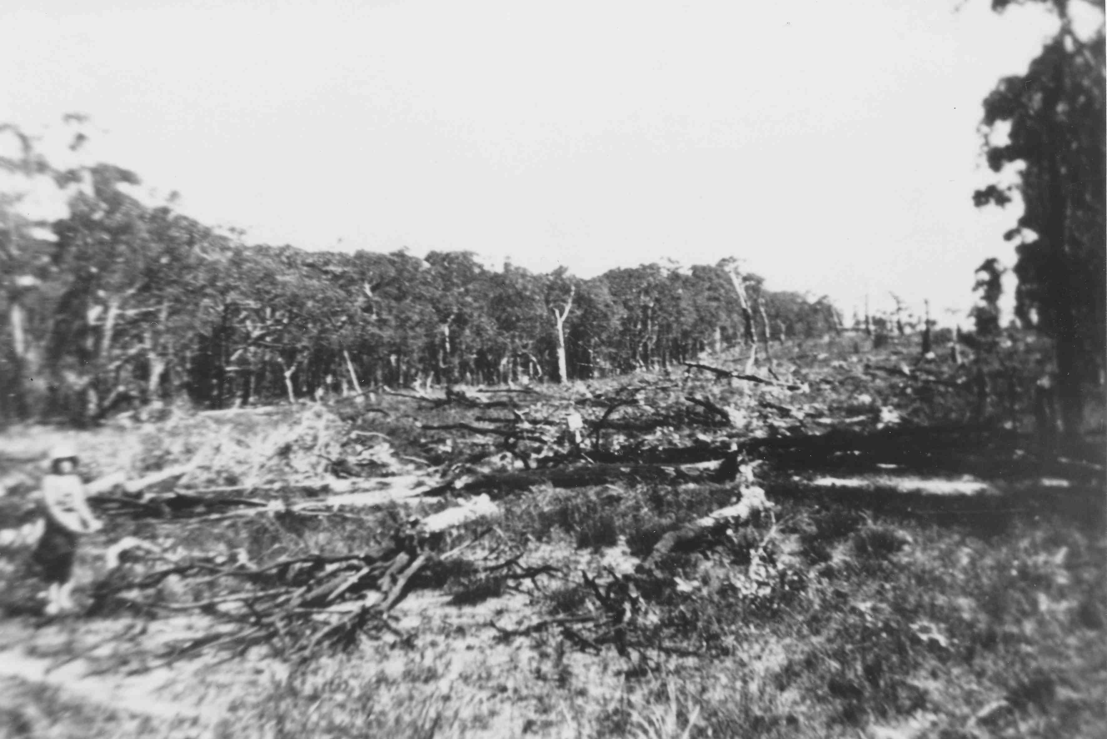 HISTORYBittern c.1936. Clearing land at Bittern. A field of felled timber.