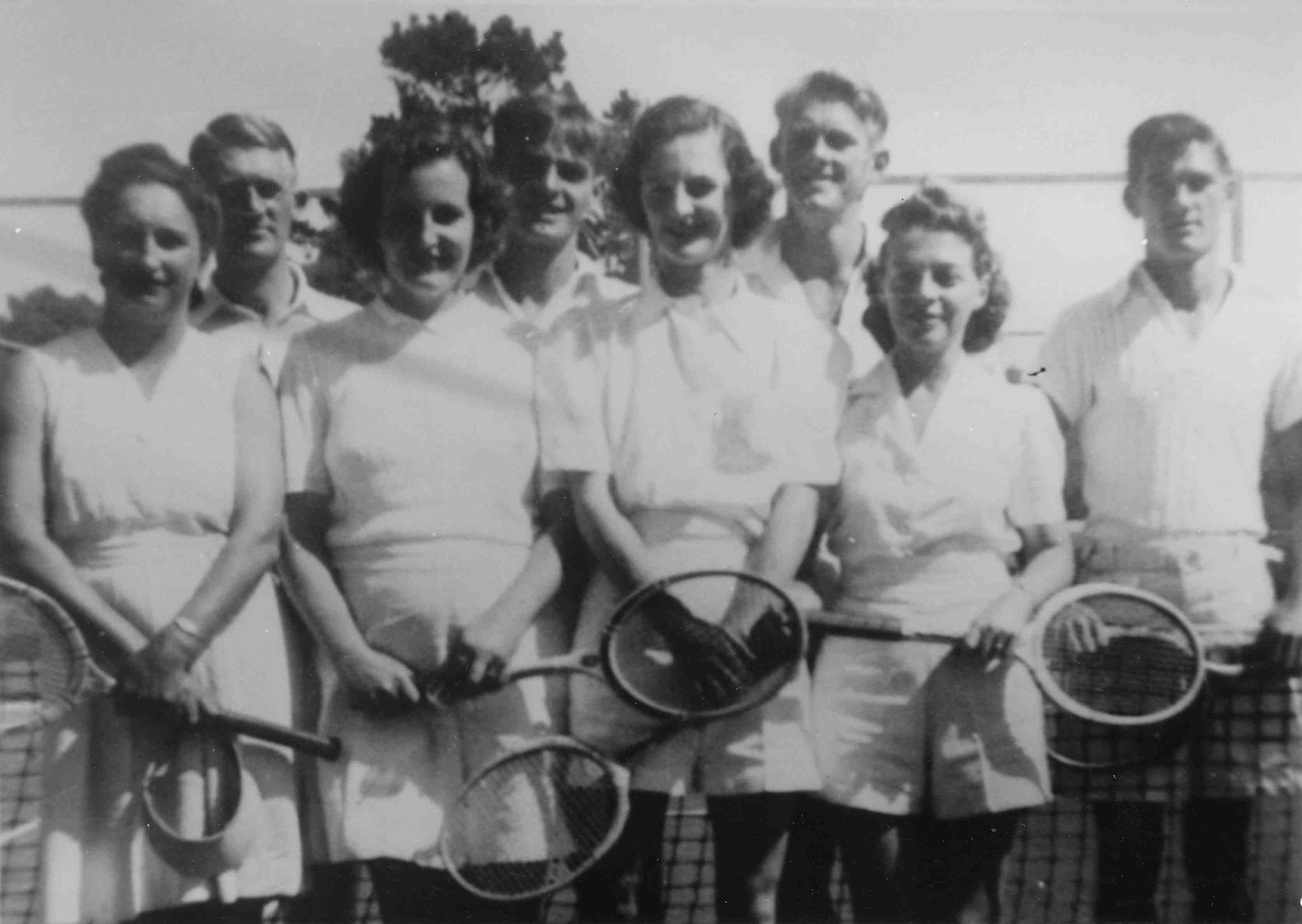 Somers ‘B’ Tennis Team, Premiers. L to R: Thelma Craven (Crib Point), Ken Boadle, Margaret Smith (Crib Point), Frank Stone, Dot Byrne, Don Richardson (Coolart), Jess Mongomery, Terry Stalhurst (Navy)
