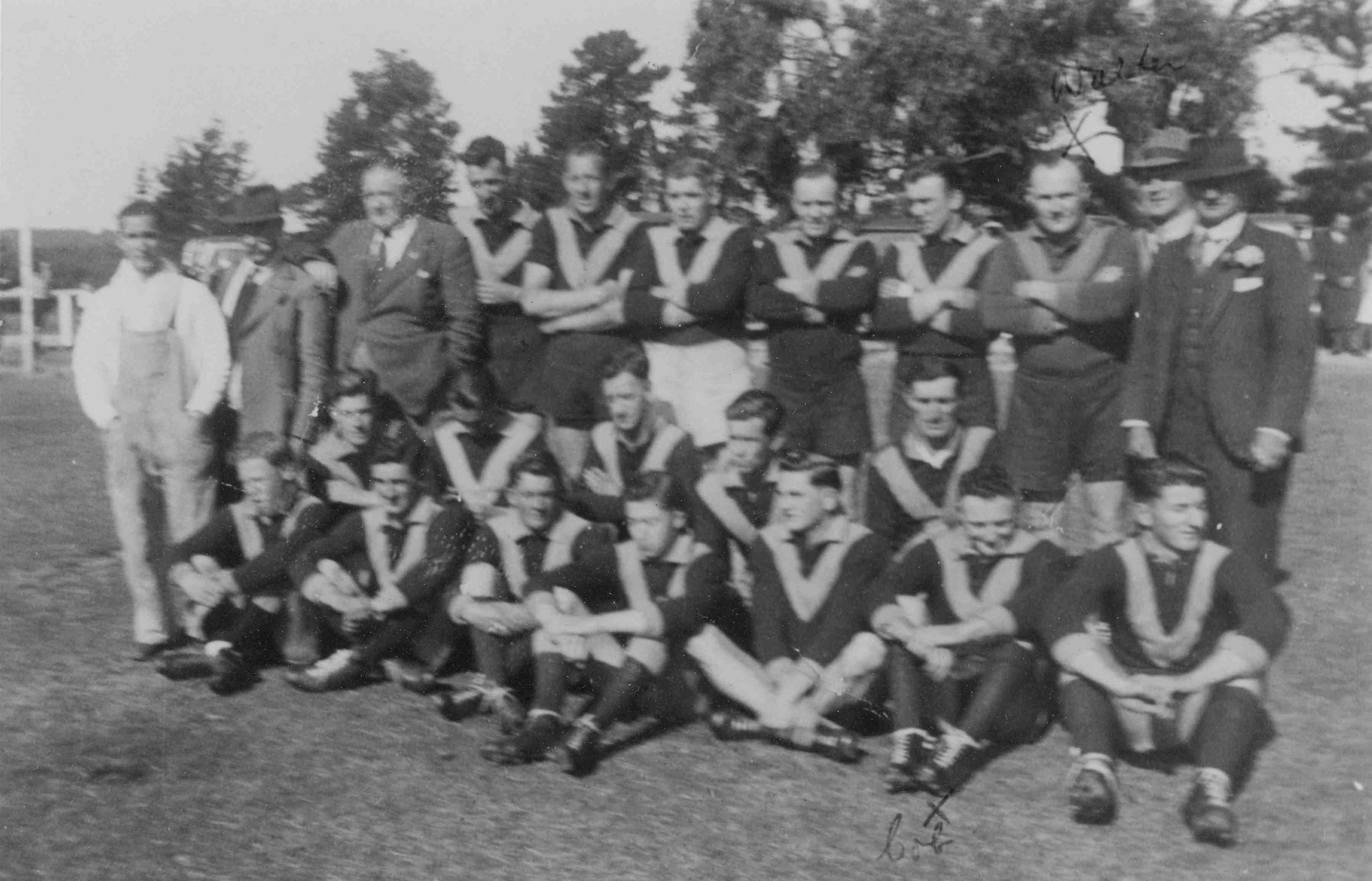 HISTORYBalnarring 1939. Balnarring v Depot 2nd semi final team at Frankston. ‘ won by Depot by 5 points. Captain Ron Peterson (left) gave the team a pep talk at 3/4 time. Fred Colyer in centre. Unknown,
