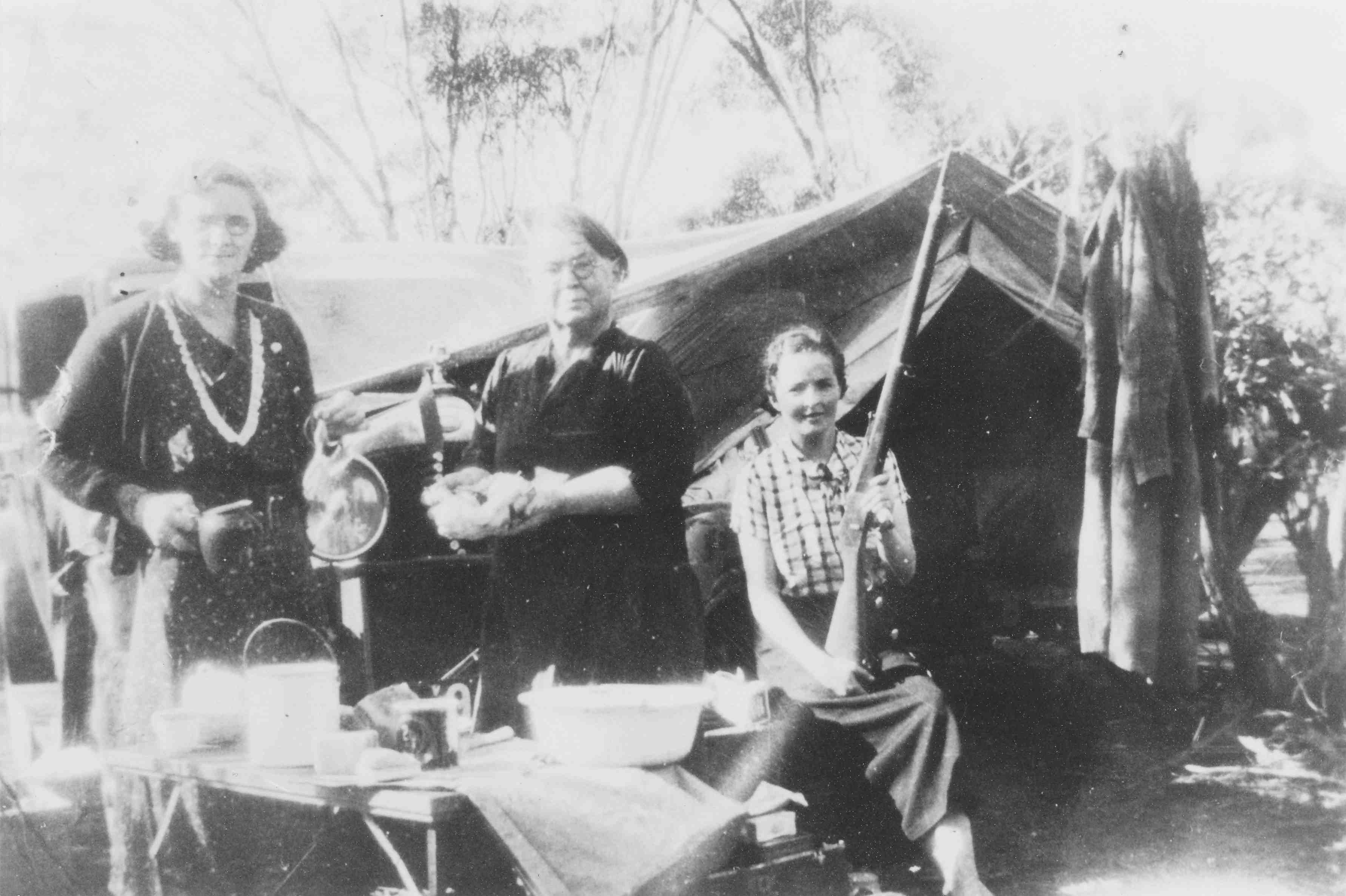 HISTORYBalnarring c.1940. Women in front of an army tent in Kinsella’s garden, Beach Road. Margaret Kinsella is holding the rifle.