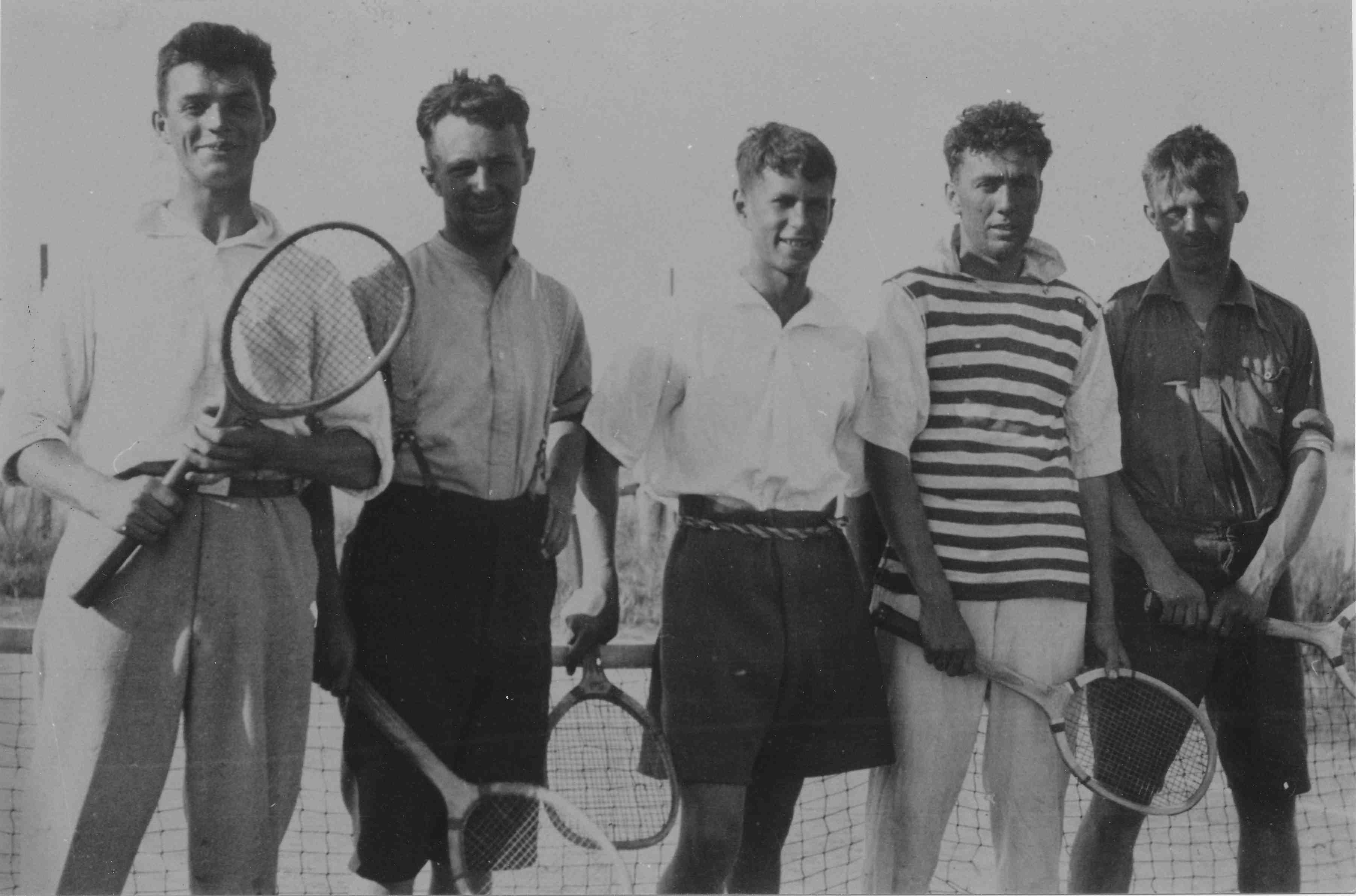 HISTORYMerricks 1927. New Tennis Fashions. Group of young men who camped annually on cliff top at Merricks Beach in late 1920s.