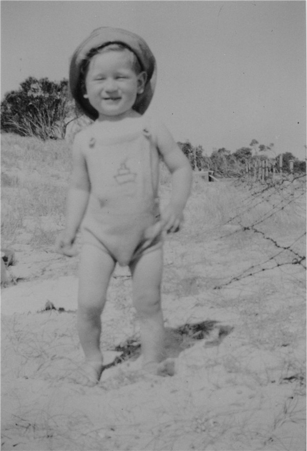 HISTORYMerricks Beach, 1943. Tank traps visible in the backgrouno date. the child is Perry Larsson.