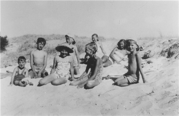 HISTORYMerricks Beach, c.1954. a group on holiday. L to R: Geoff Brooks, Perry Larsson, Carla Larsson, Robert or Andrew Bell (twins), Jenny Bell, Olga Bell, Norma Larsson, Andrew or Robert Bell.