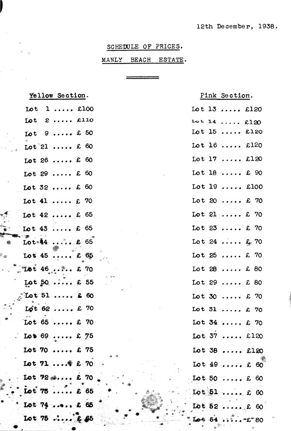 Merricks Beach, 1938. Schedule of prices for Manly Beach Estate.