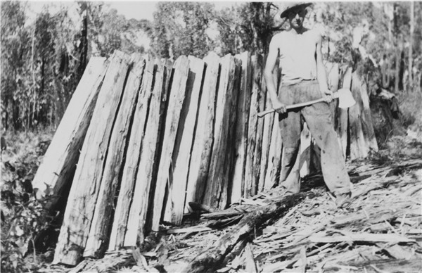 HISTORYMerricks North, 1938. Split posts for fencing and Garry Downward at Tubbarubba..