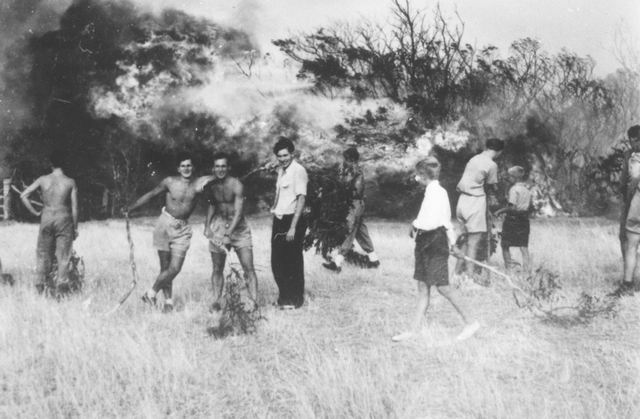 Fire broke out originally inlagoon area during drought season. It was decided to clear away and burn woody matter. Peat caught fire and burned for days until a high wind ignited sparks when the fire surfaced at a different point. Old shearing shed was burned. K Roberts, M Luxton, Roffey.