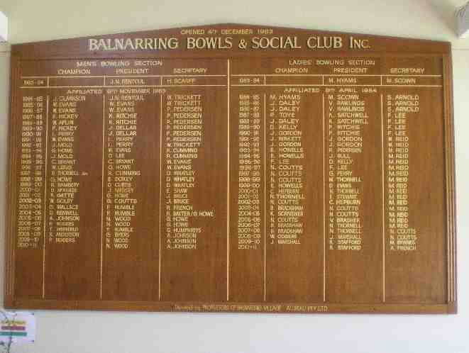 HISTORYBalnarring 2011. Bowls & Social Club established in 1983 -honour roll listing champions, presidents and secretaries.